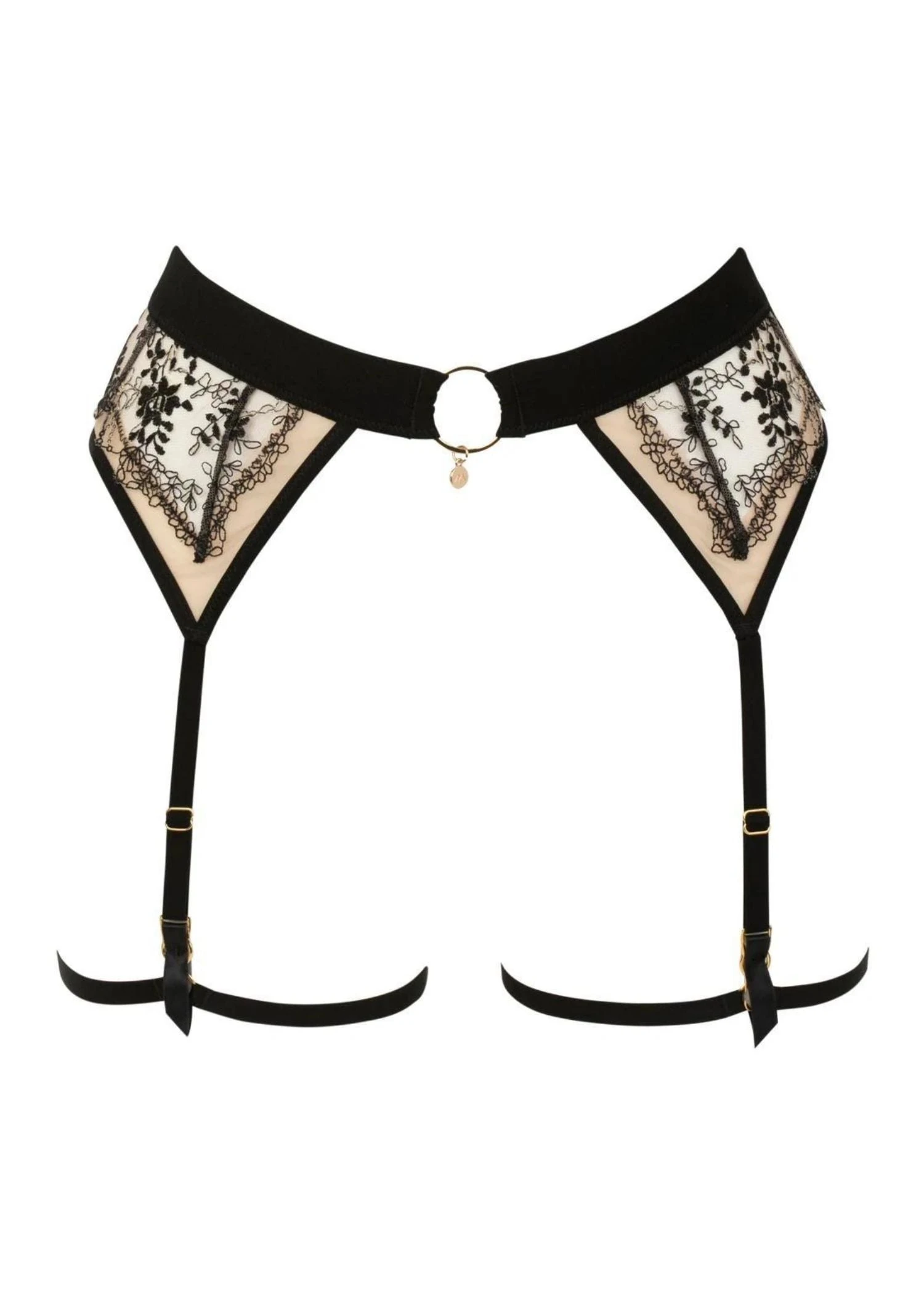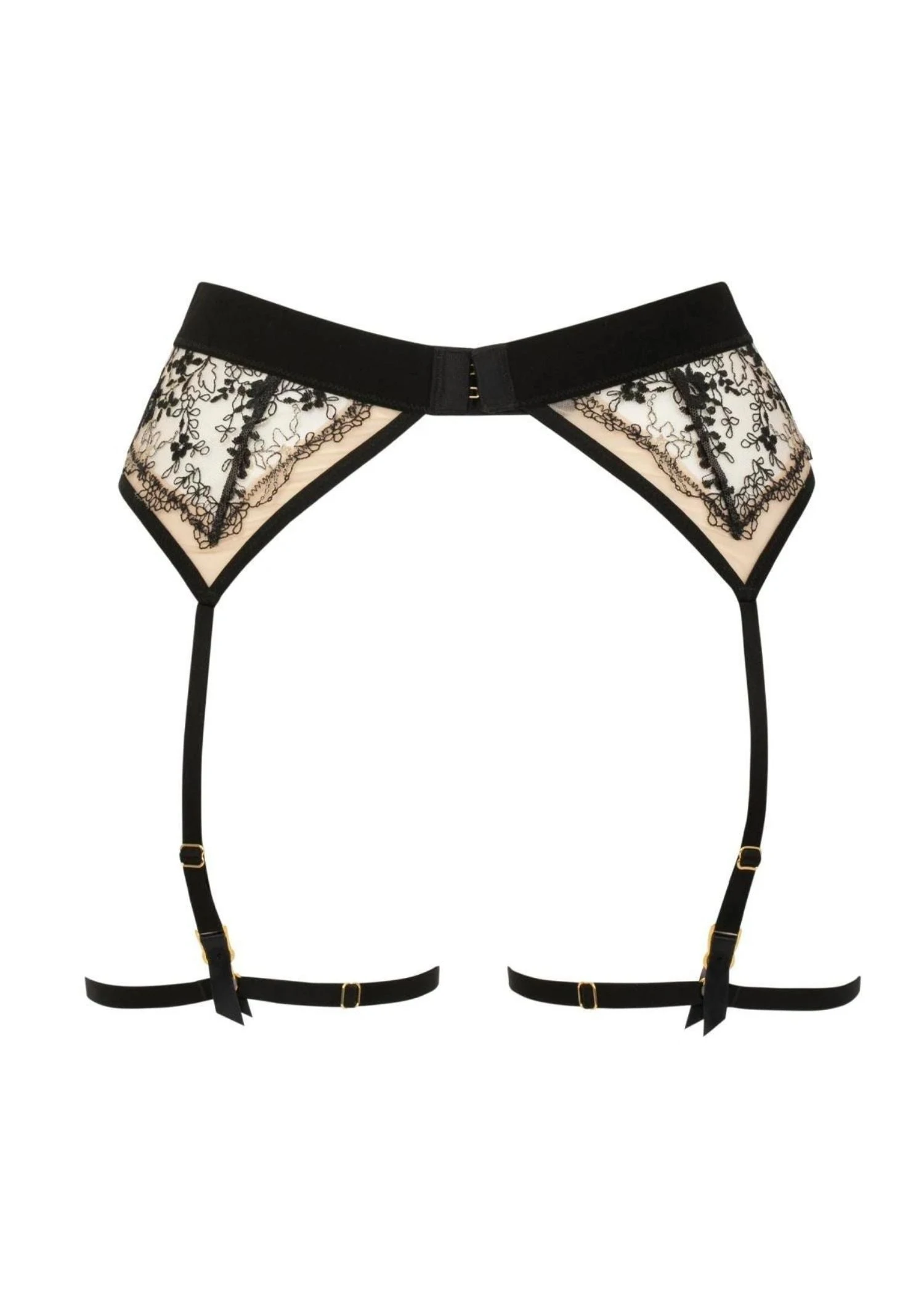 Complete the After Midnight collection with the luxurious Suspender & Garter belt. Featuring delicate black floral embroidery on nude mesh, a wide waist band and golden buckle in front that is both comfortable and flattering. With detachable garters, so you can wear this with any stockings you choose for an versatile and alluring look.