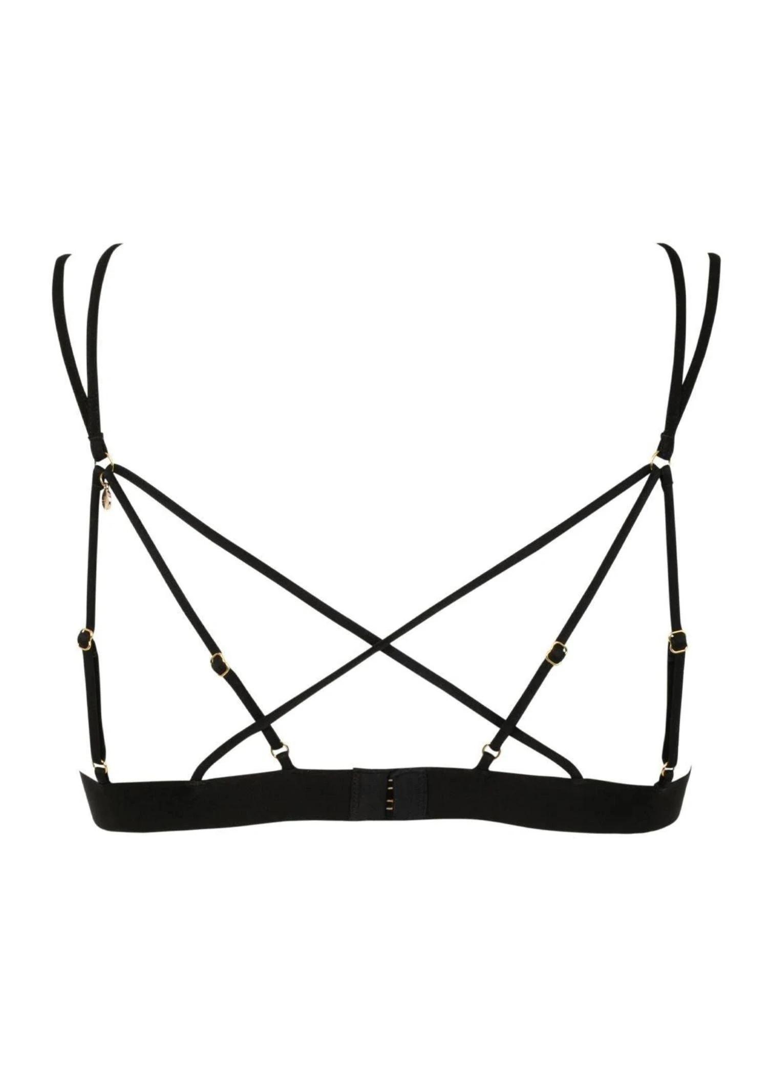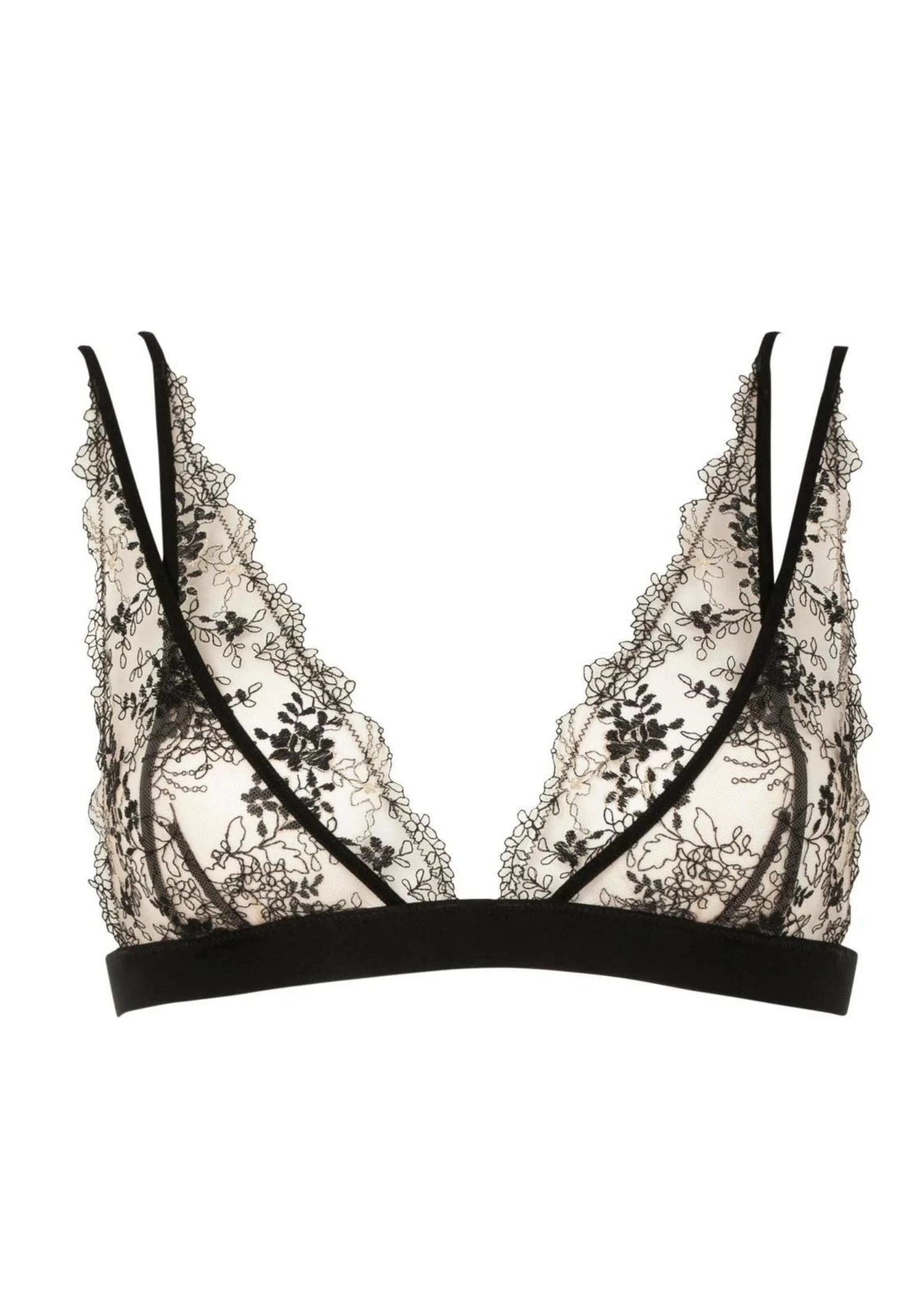 Lingerie never looked so good. A refined take on the classic bralette, this soft triangle bra features subtle black floral embroidery on nude tulle and gold threads throughout, making it a stunning ethereal piece.