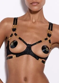 Alyss’ knicker ouvert offers mysterious allure with a combination of delicate floral lace and glossy PVC detailing. With this captivating piece, you can evoke feminine dominance. This combination of materials ensures all-day comfort and support with a fashionable edge. It’s sure to make you feel confident, without sacrificing comfort.