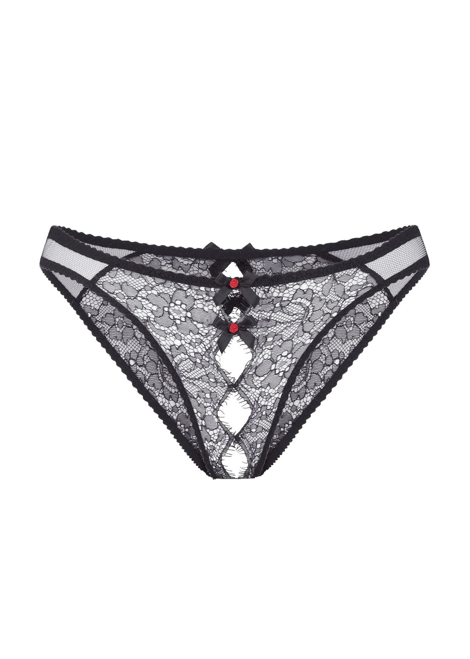 Our bestselling Lorna Lace Ouvert (Black) celebrates your playful femininity with naughty open gusset, satin bows, French seam detailing, and scalloped edges, all exquisitely crafted from black lace. Add something special to your lingerie collection!