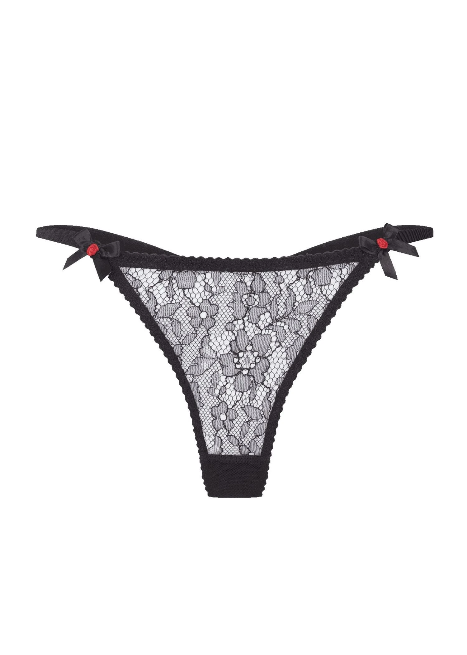 Fall in love with our Lorna Lace Thong in classic black. Its delicate lace, satin bow and miniature rose detailing, French seams, and scalloped edges make it a truly timeless and romantic piece that’s sure to wow anyone!