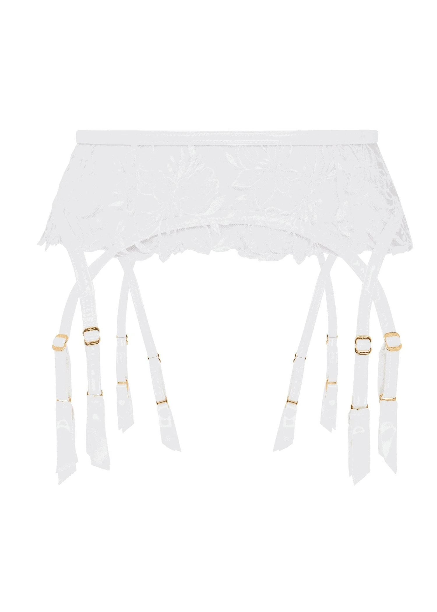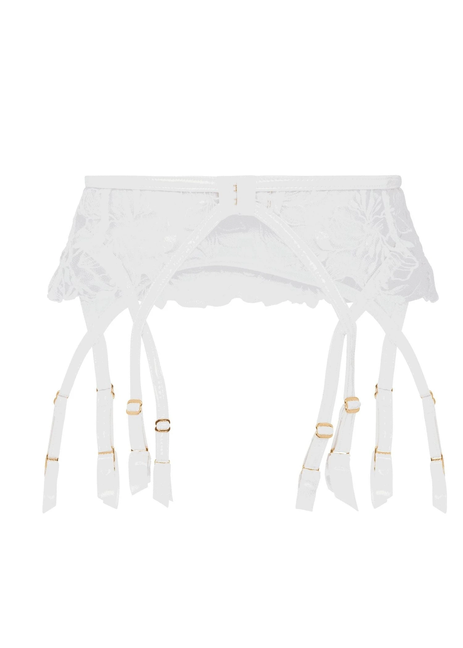 Let Ozella’s white suspender ignite your fantasies! Feel the thrill of floral Swiss embroidery and the daring shine of a wet look finish. Seductive PVC bindings and real gold-plated hardware adds a luxe touch to her skirted design. Ignite the night with Ozella!