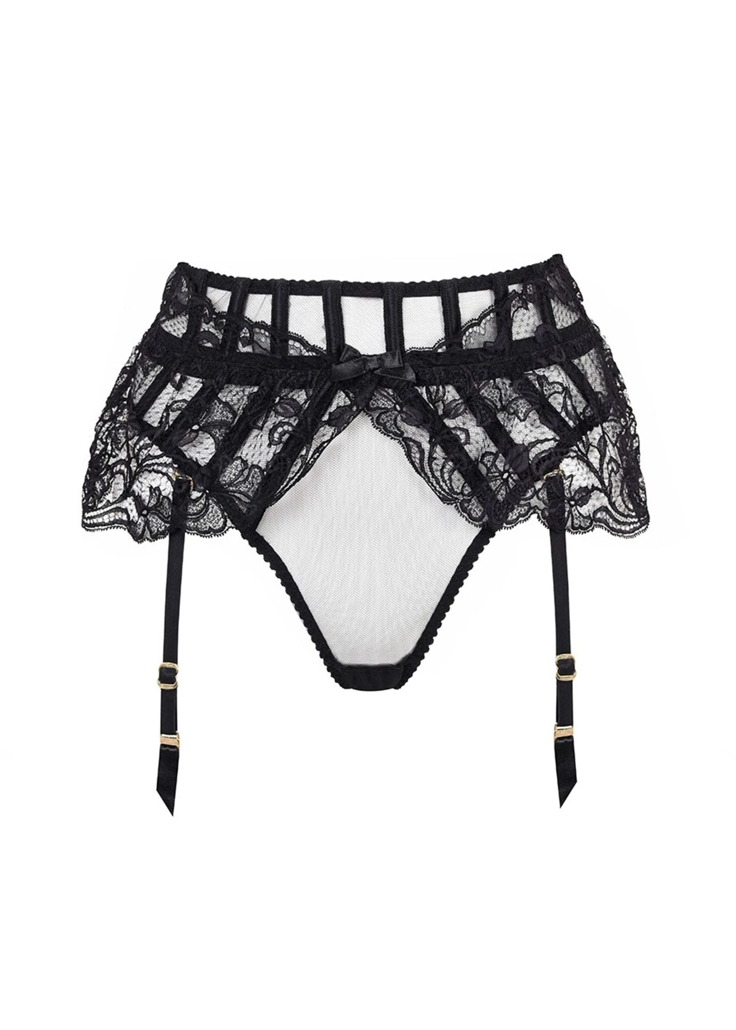 This waist cincher-style thong fastens at the back , and comes with four detachable suspender straps. For maximum glamour, pair this suspender thong with the matching Rozlyn bra.