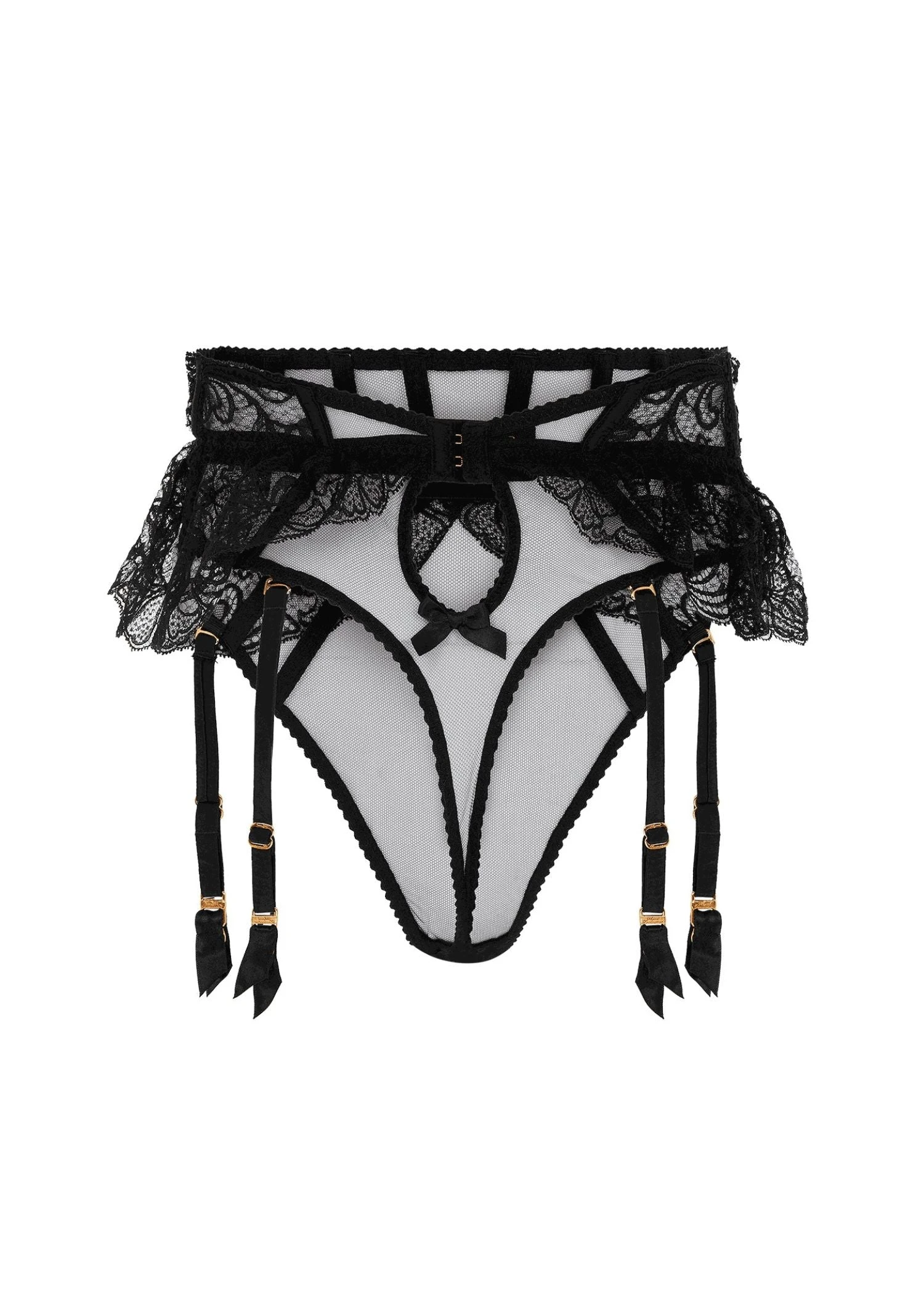 The Rozlyn suspender thong by Agent Provocateur is stunning piece you want to show off. Its high cut thong in sheer tulle with structured, satin-covered seam details that accentuate your waist while the hips are skirted with a ruffle of French Leavers lace, it emphasizes your curves even further.