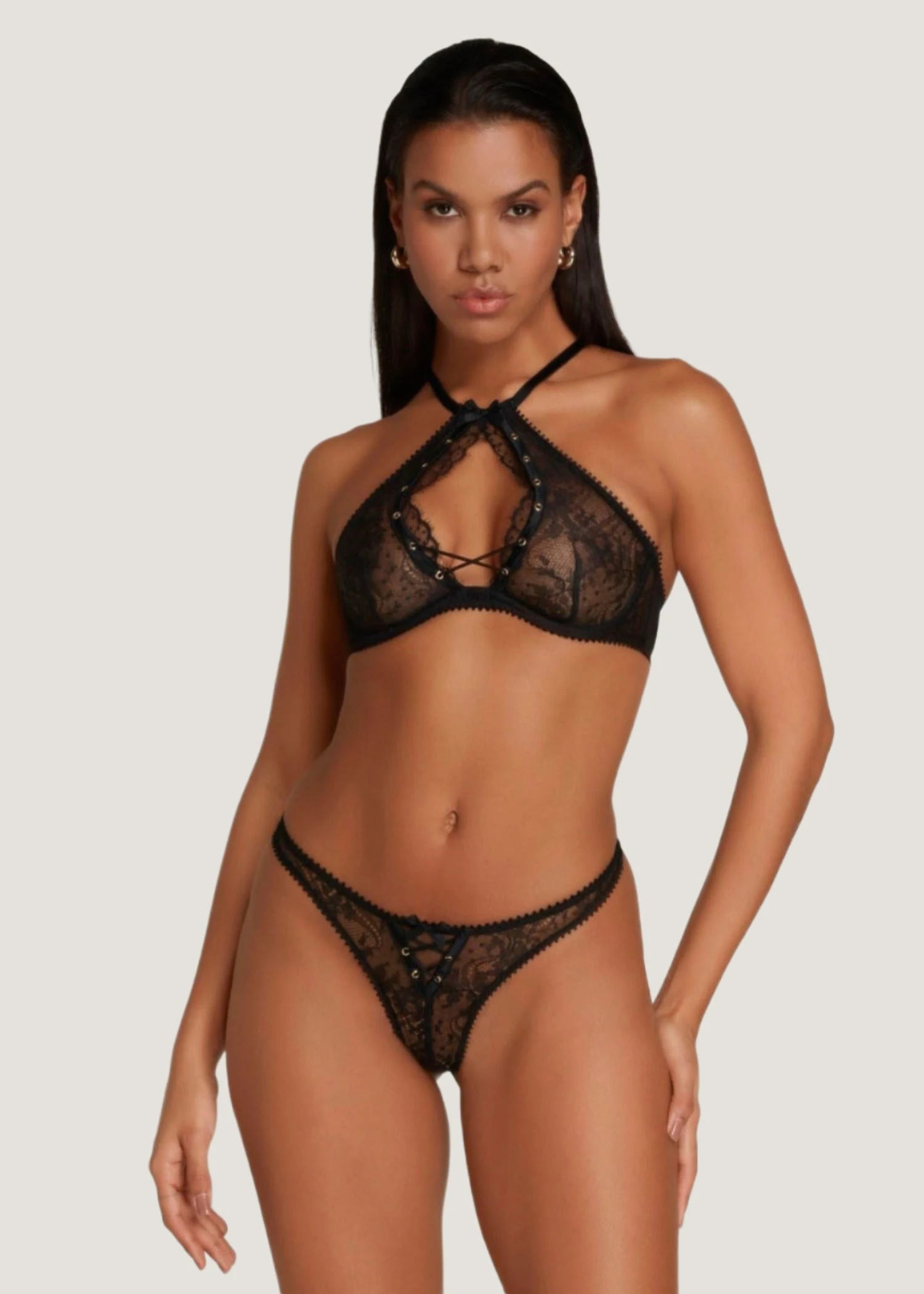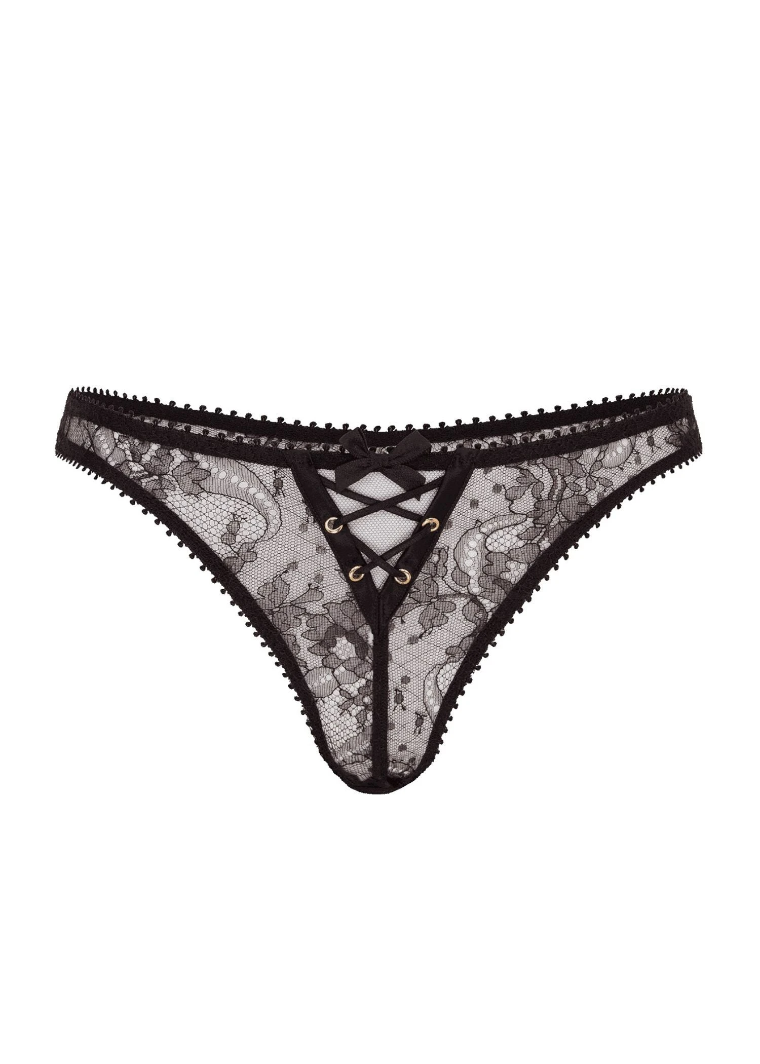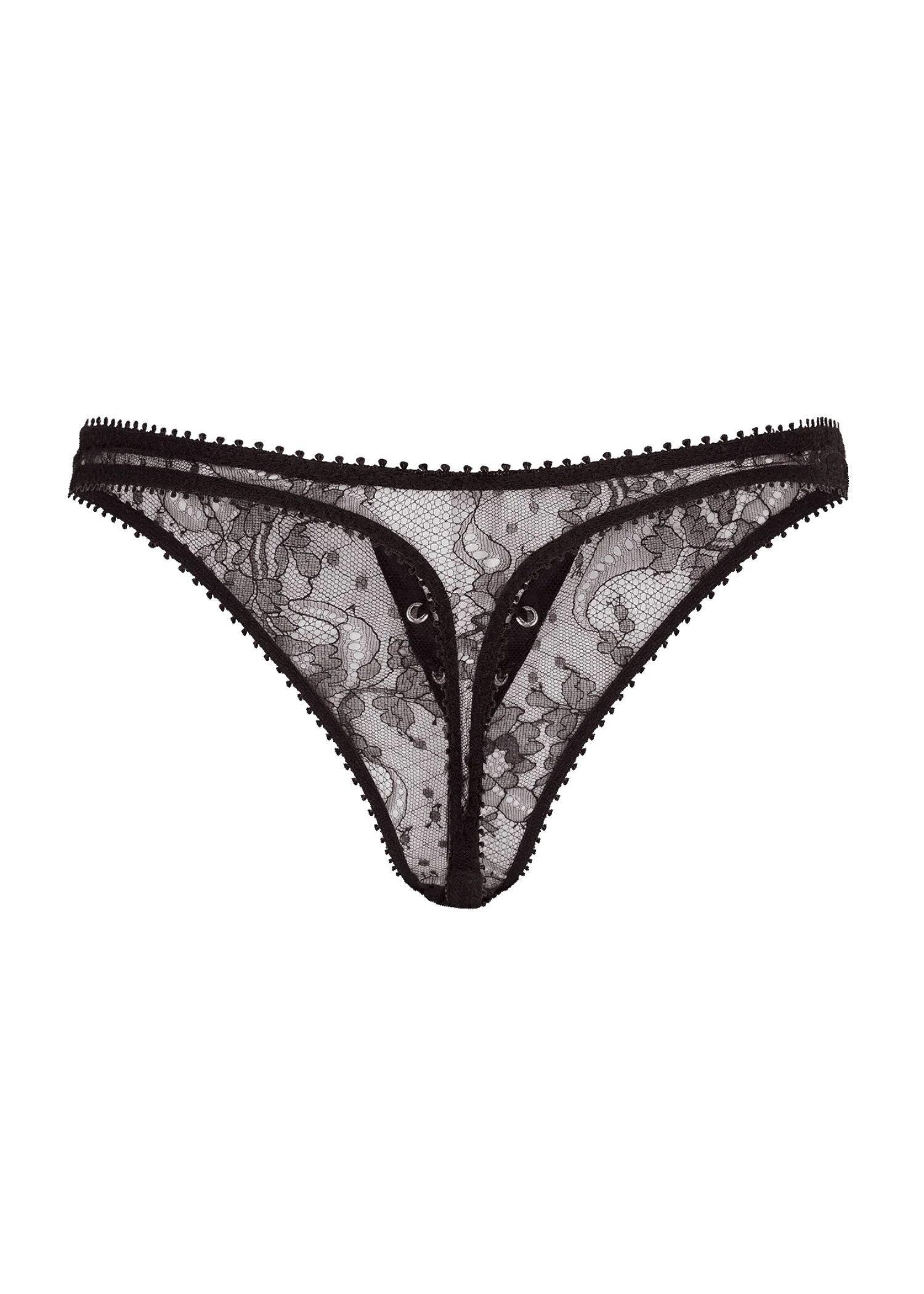 Unlock your sensuality with Vallentina. Crafted from Leavers lace, this thong is the perfect blend of sophistication and allure. Its gleaming hook-and-eye detailing can be used to conceal or reveal your inner desires, allowing you to embrace your daring side when the mood strikes.