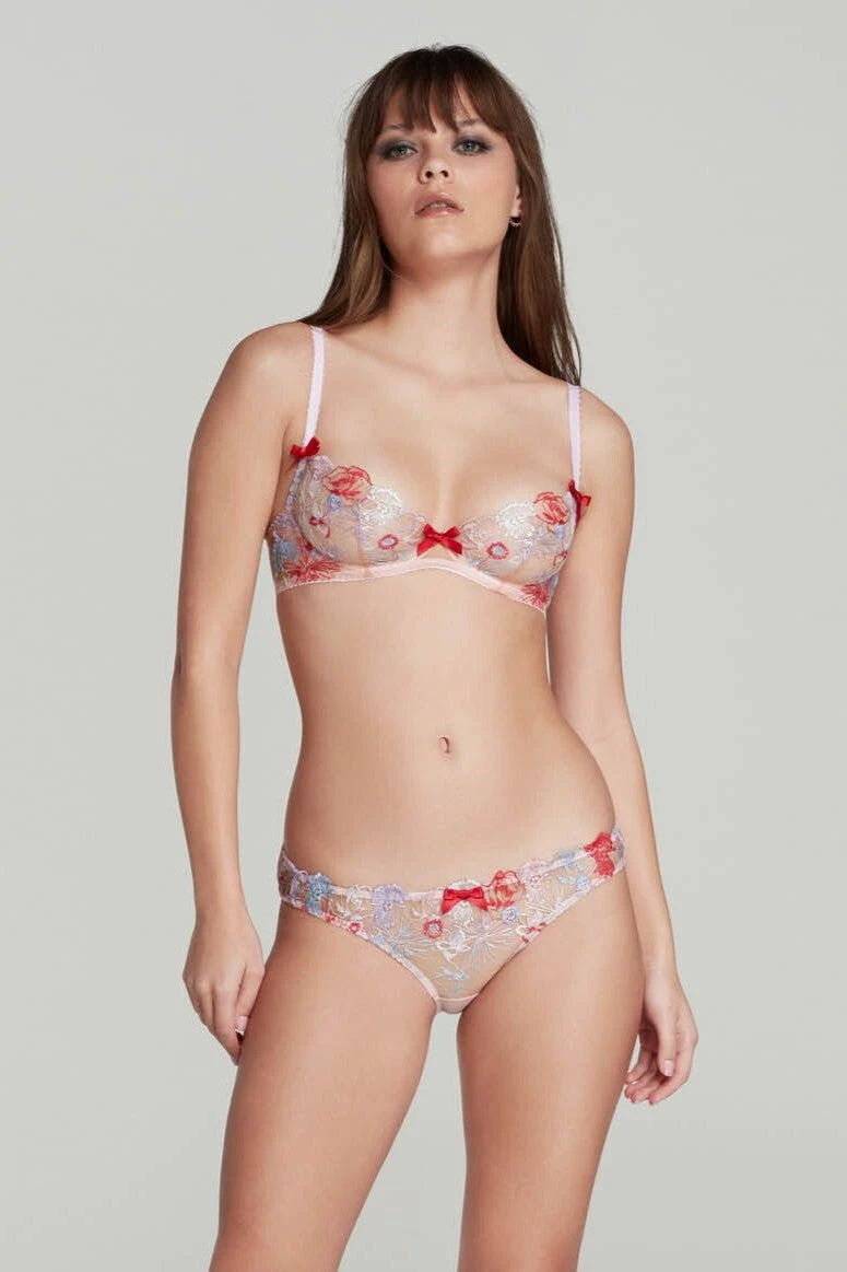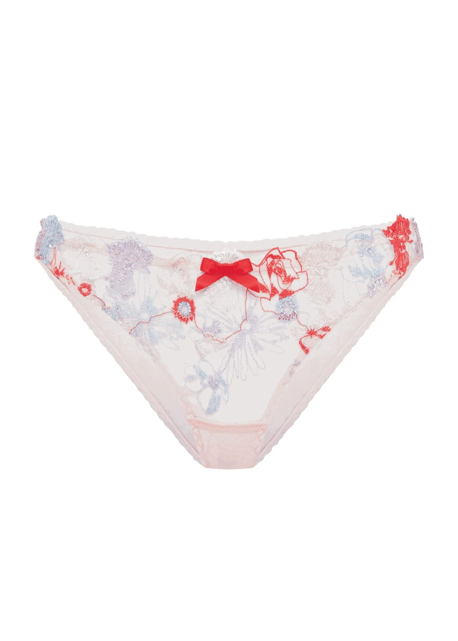 Feel gorgeous in the Zuri Brief. Enjoy the dreamy combination of French embroidered floral motifs in shades of pink, blue and scarlet, as well as the elasticated satin-finished waistband, featherlight tulle and rear seam that sculpts and shapes. Get the full-on feminine glamour look when wearing this charming set of lingerie. Bloom timelessly in Zuri!