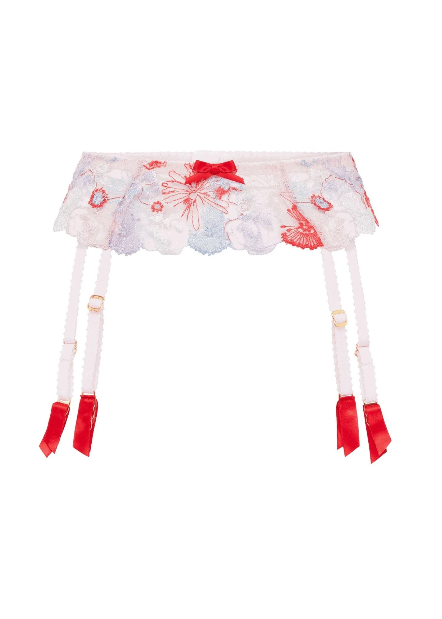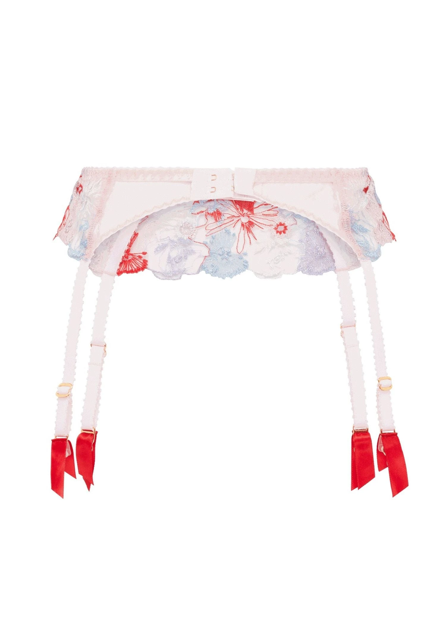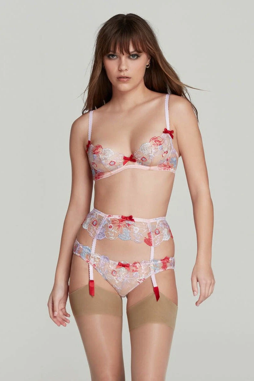 Unleash your inner goddess in the gorgeous Zuri Suspender! Crafted with featherlight sand toned tulle and French embroidered floral motifs, this suspender belt will add a bold burst of color to your lingerie wardrobe. Even the plating on the strap sliders is made with real gold for an added element of luxe! Feel beautiful and empowered as you rock this stunning piece.