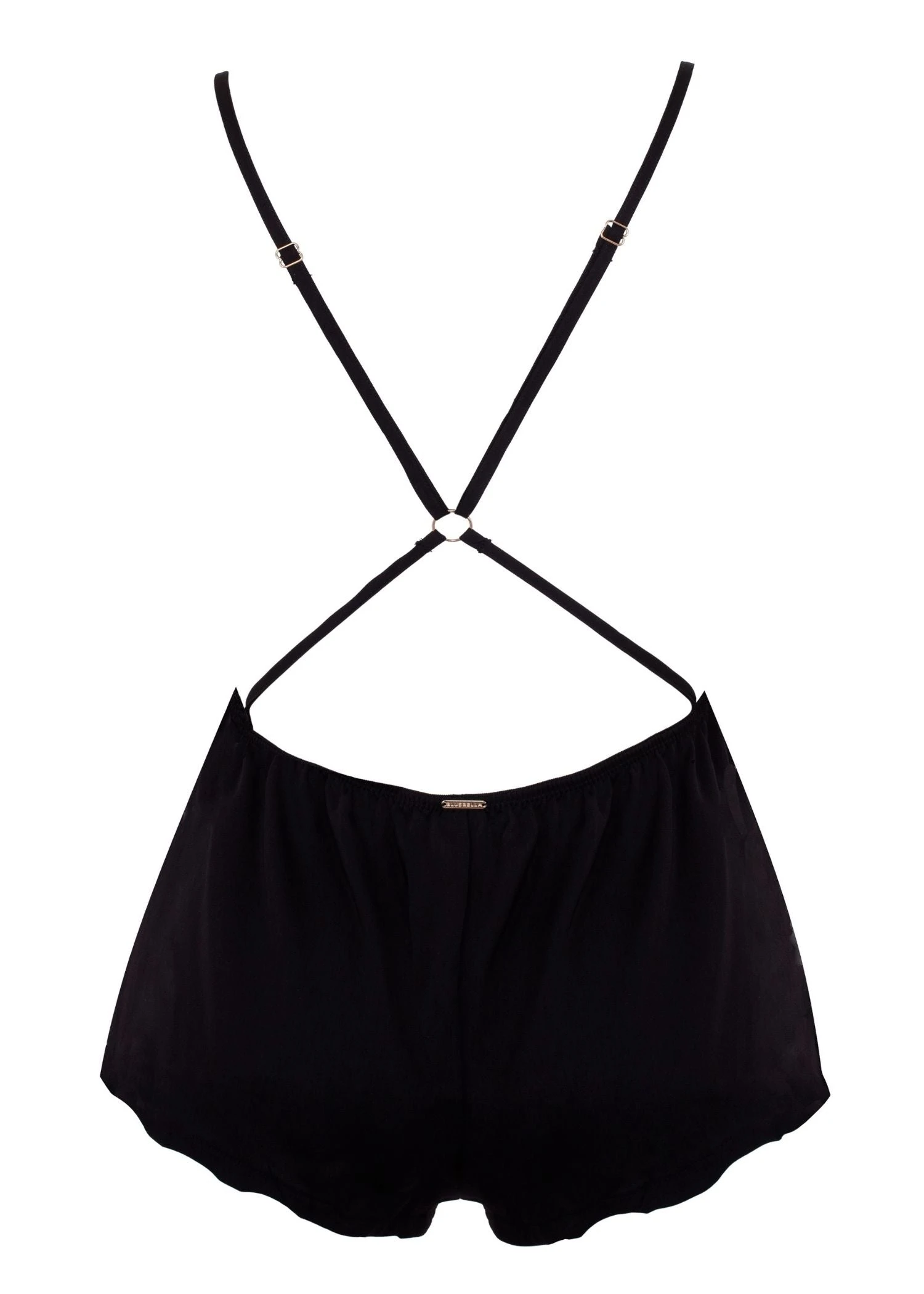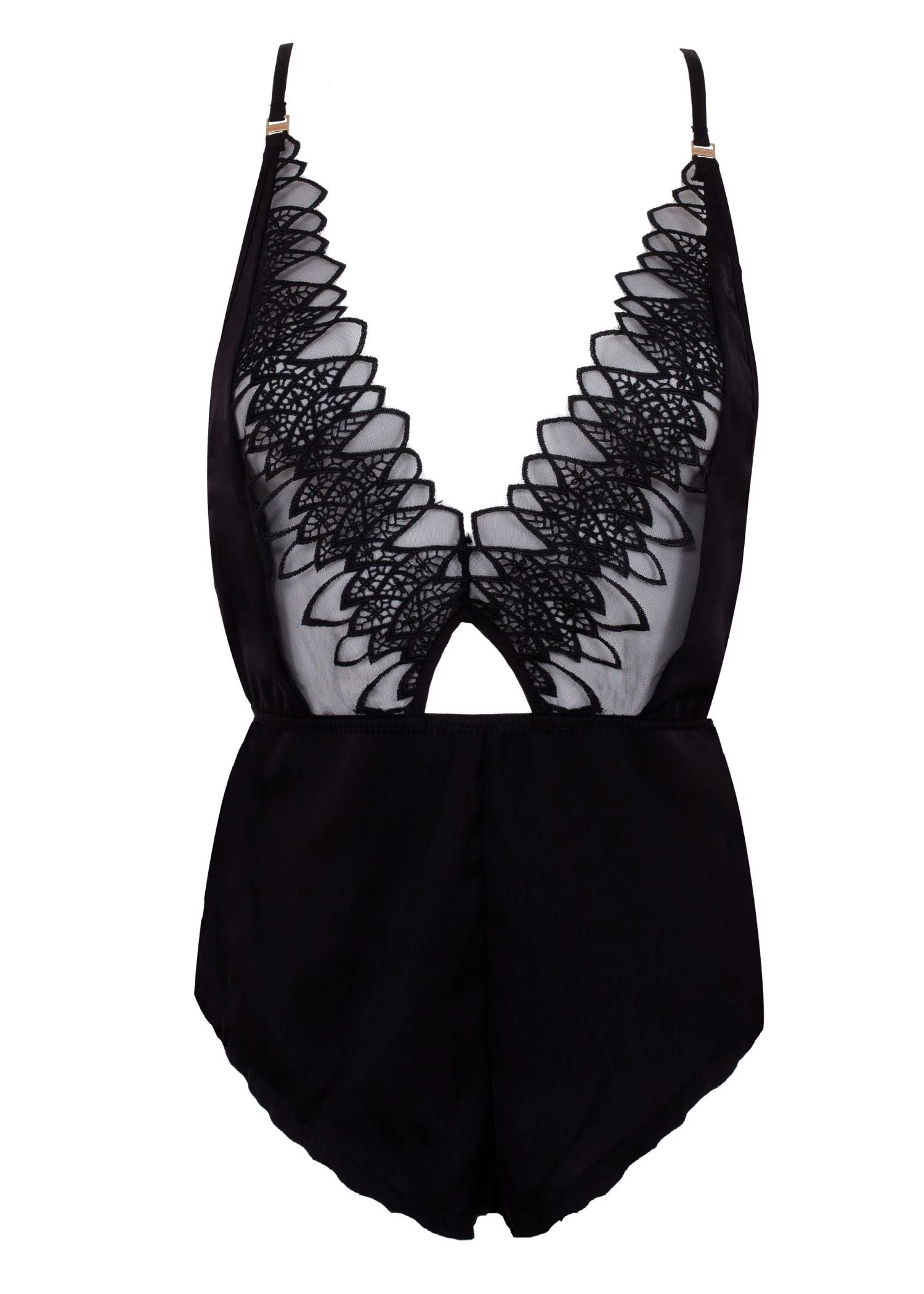 Unlike your ordinary loungewear, the Alina Teddy incorporates a sultry plunging neckline of embroidered mesh and sleek crossover back straps. Perfect to lounge in or worn as outerwear.