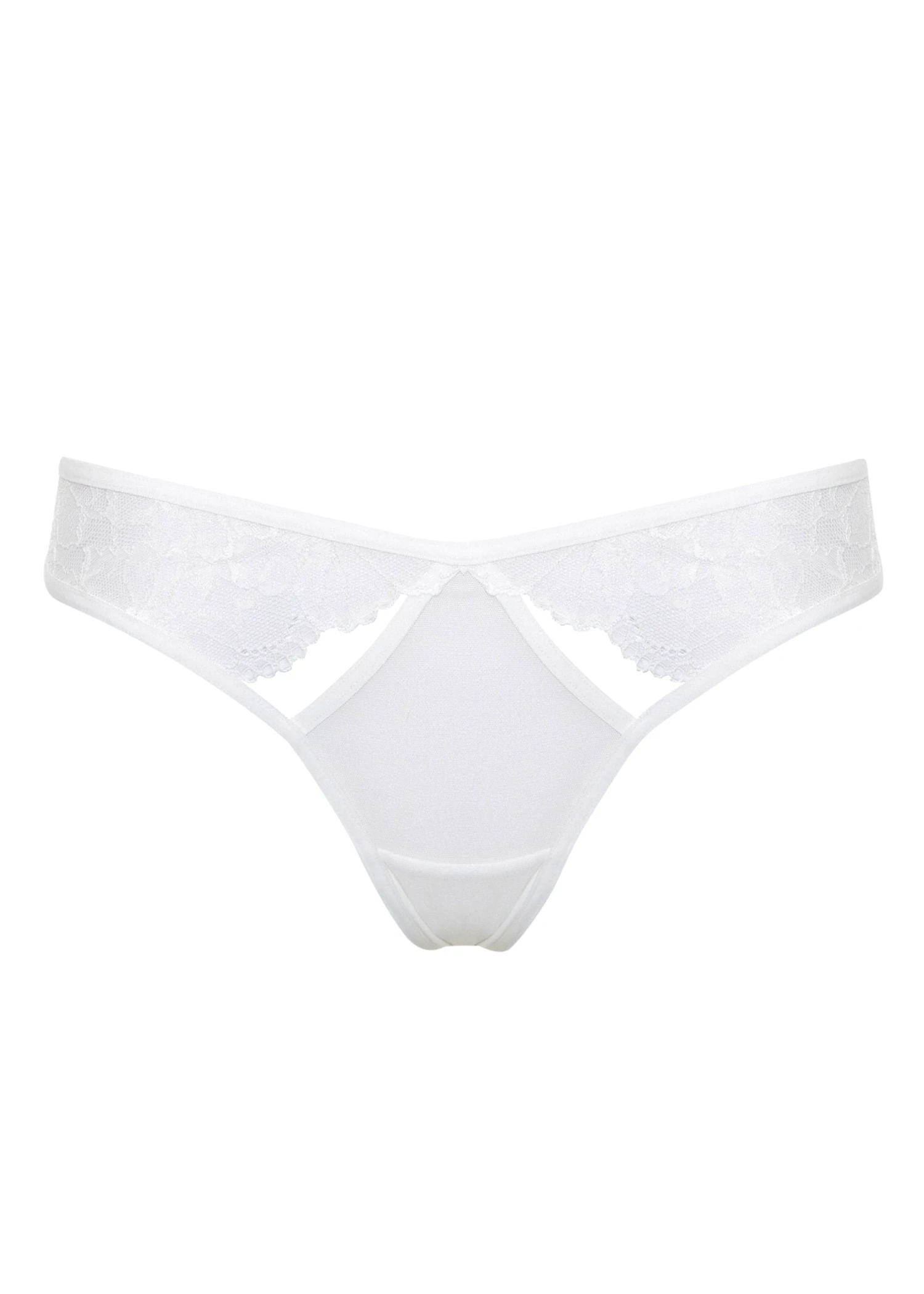 The Emerson Lace and Mesh Thong in Ivory is an understated piece. With sheer lace panels running through the front to the back, the subtle elegance is further accentuated when matched with the luxurious Open Cup Lace Bra.