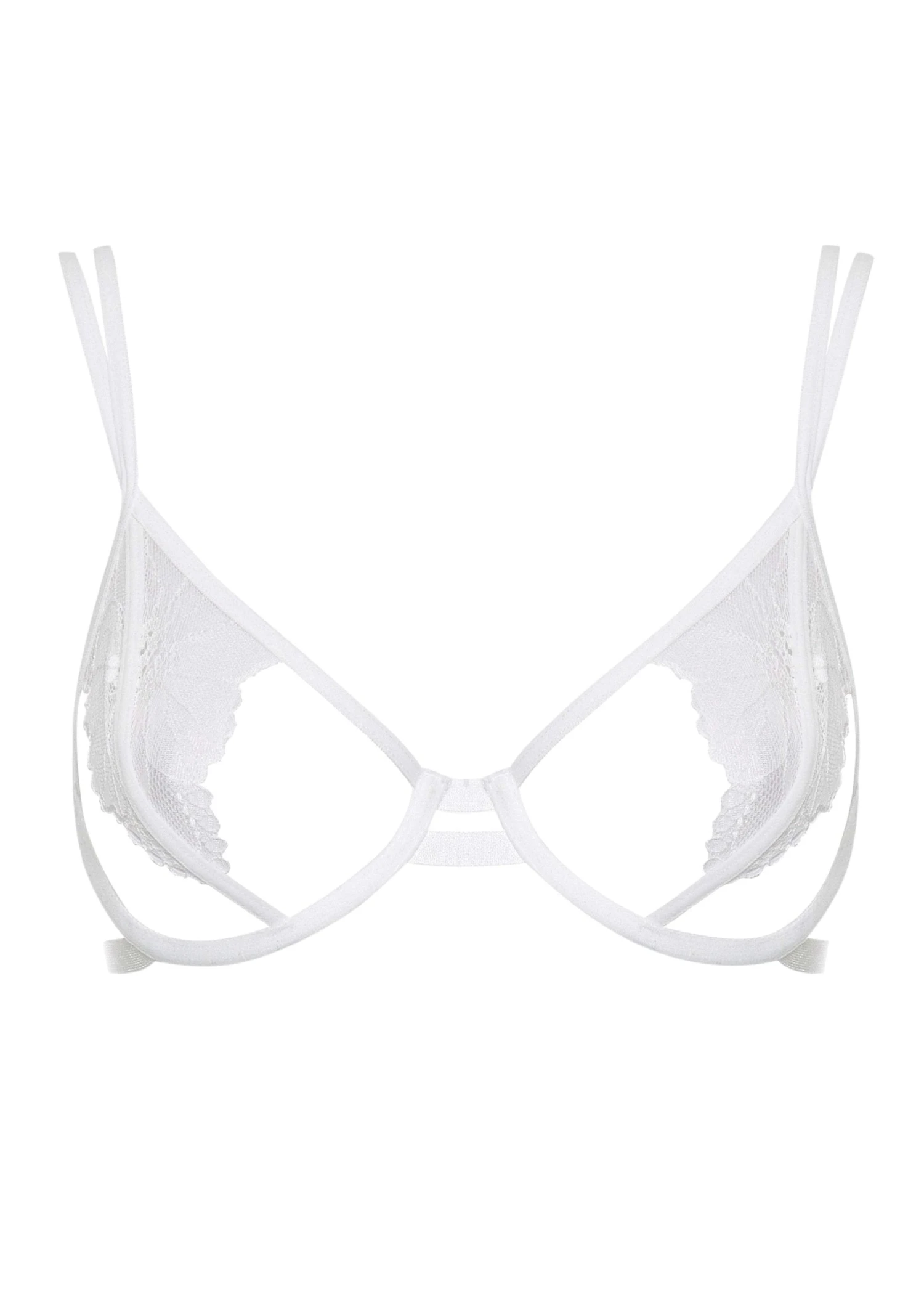 This classic ivory Bluebella Emerson Open Cup Lace Bra with double straps caging the back is the perfect choice. With the gold hardware details and luxurious lace, this piece is not to be missed. Wear it with the matching Emerson Lace Back Brief or Thong and Lace Harness.