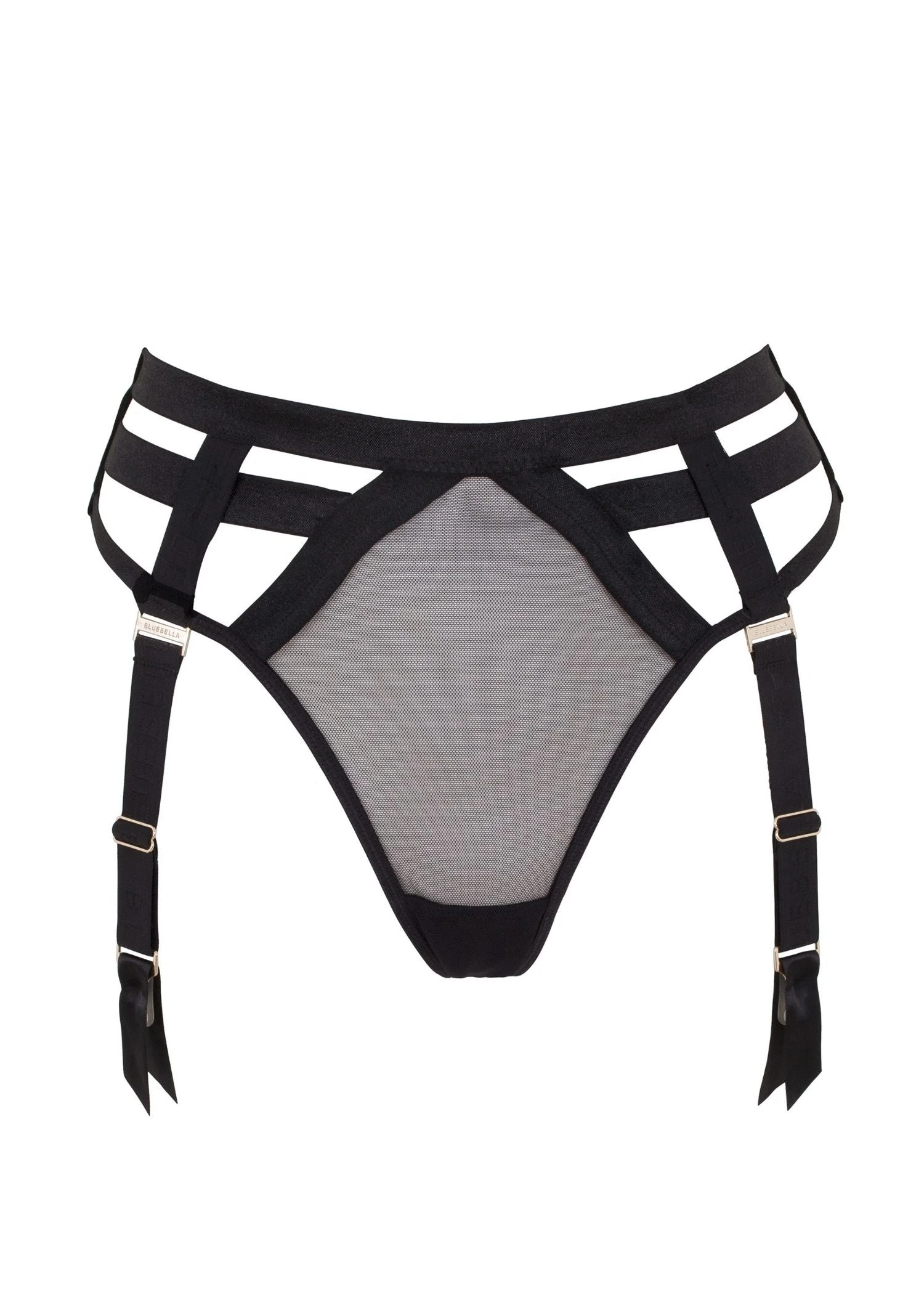 Combining bold directional strapping and sheer mesh, the Highgate High Waist Suspender Thong is both stunning and versatile. Includes detachable suspender straps to customize to any mood.
