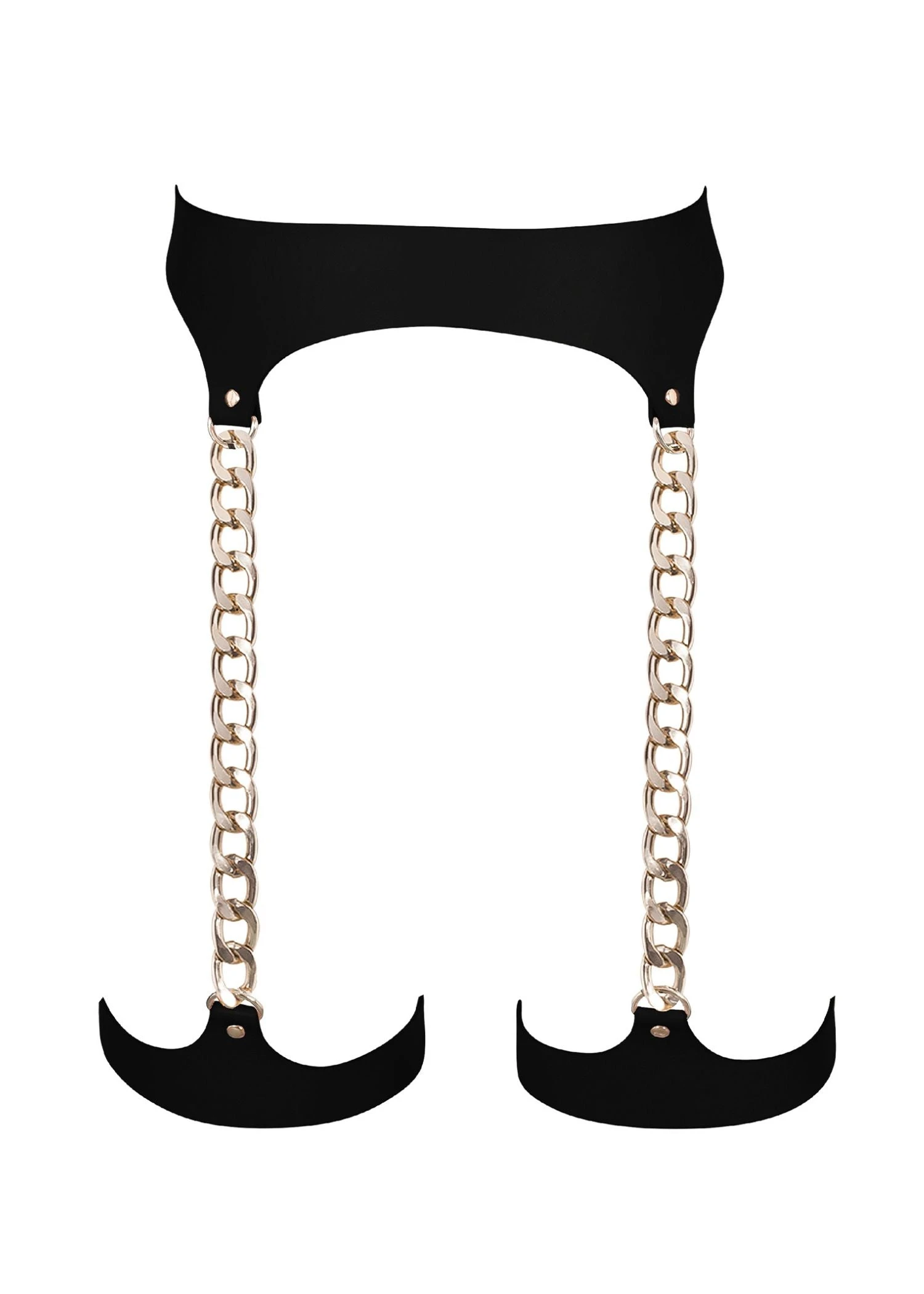 The striking Lotus thigh harness is designed with fashion and seduction in mind, blurring the line between lingerie and jewellery. Connecting sleek faux leather panels and polished, gold-tone chains, this cutting-edge piece will keep you guessing with its endless styling possibilities, regardless of how you choose to introduce it to your edits.