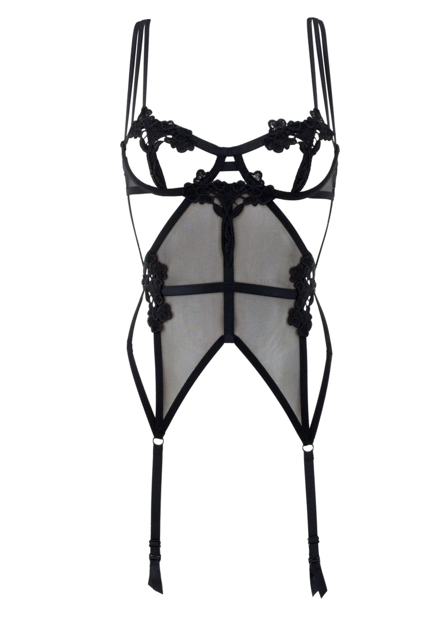 Like a birdcage decorated with wildflowers, this contemporary basque makes use of delicate lace, botanical embellishments and directional strapping to produce one heck of a provocative statement.