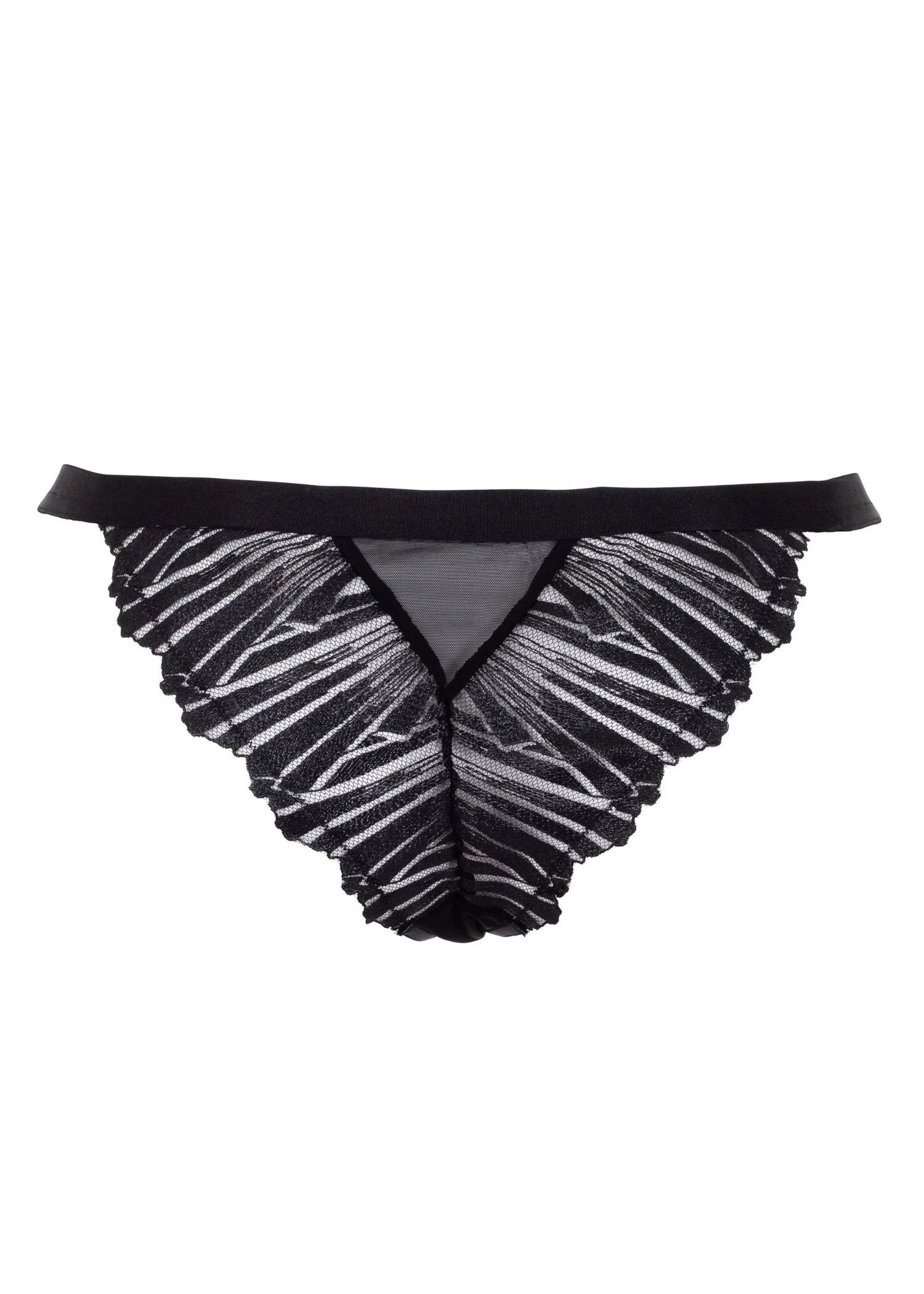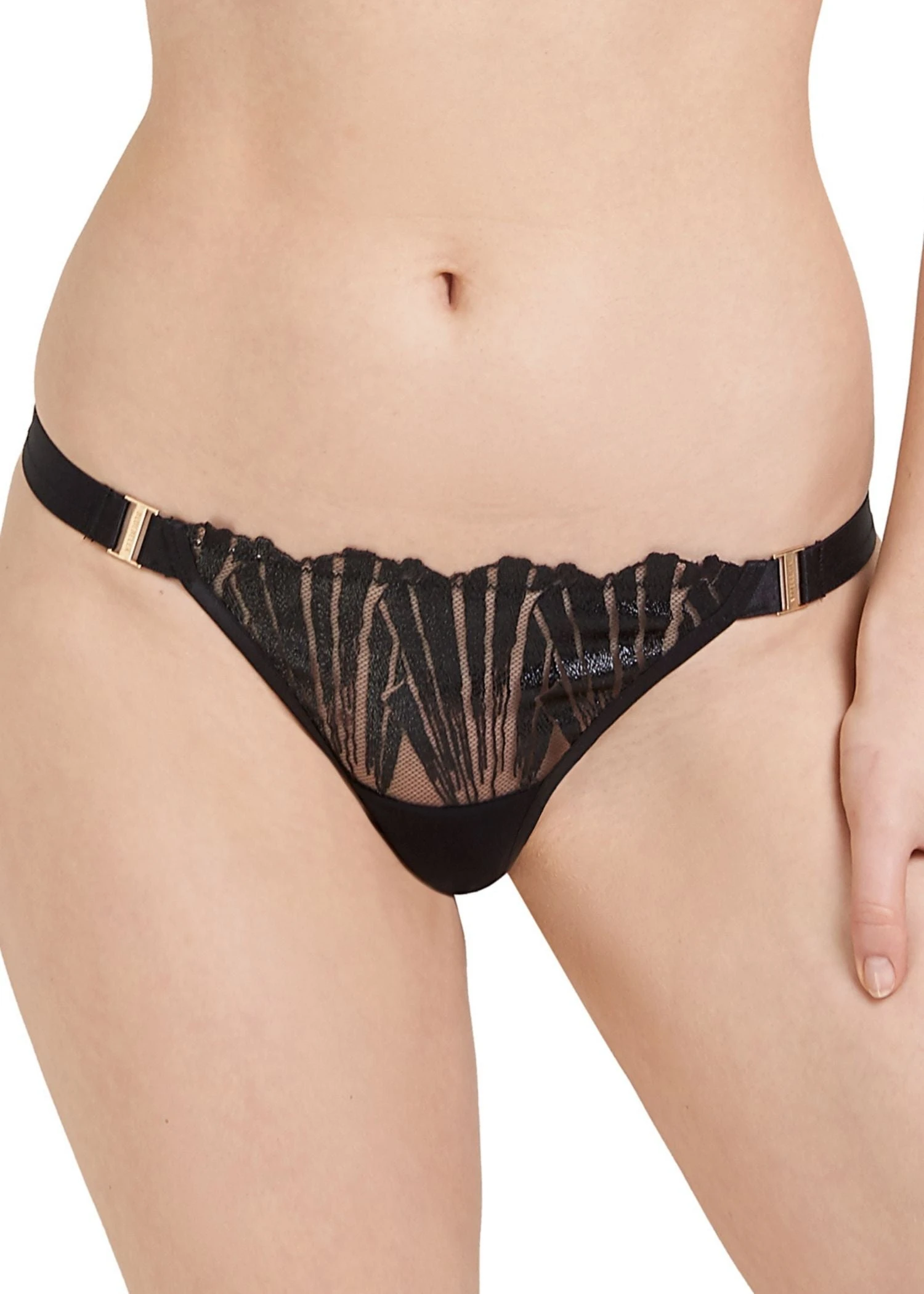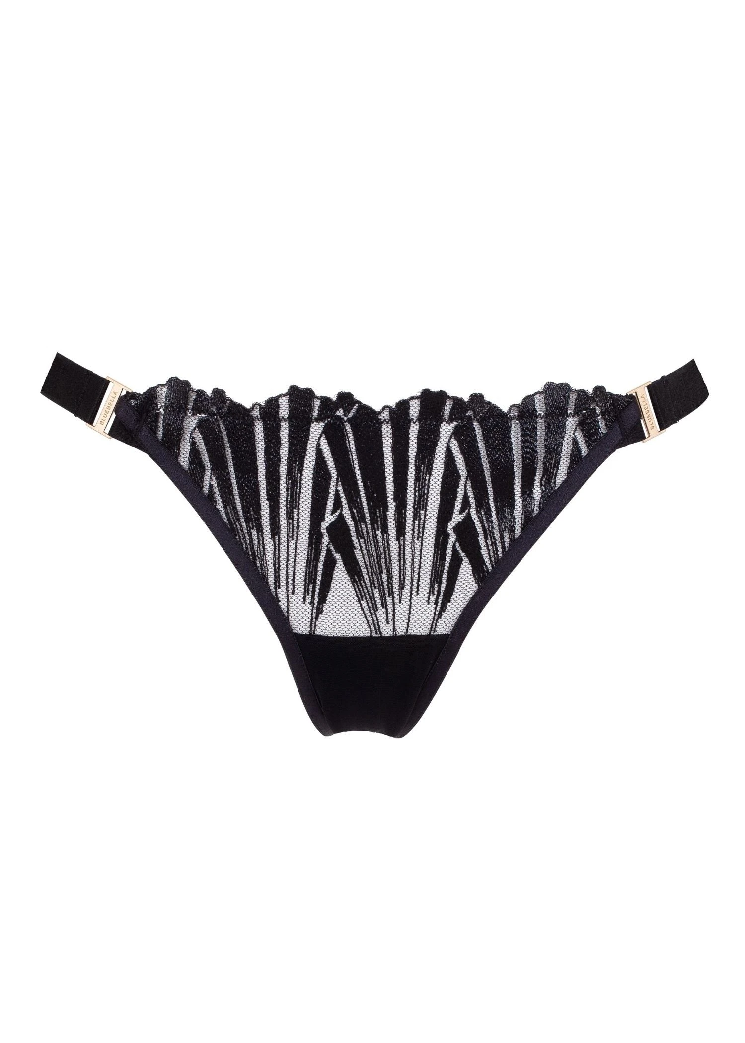 The Sofia Brief features stylised fan embroidery on mesh panels in a tanga-style silhouette to enhance and frame the body. Accompanied with wide waistbands and gold-tone hardware for a unique, contemporary look.