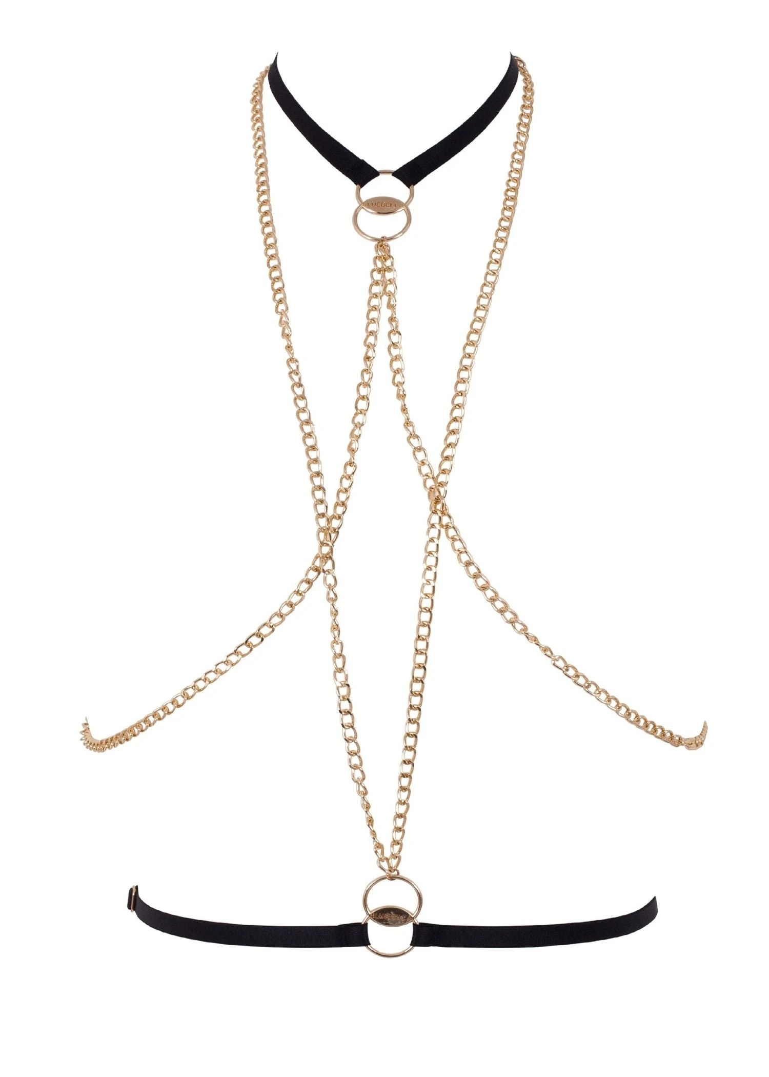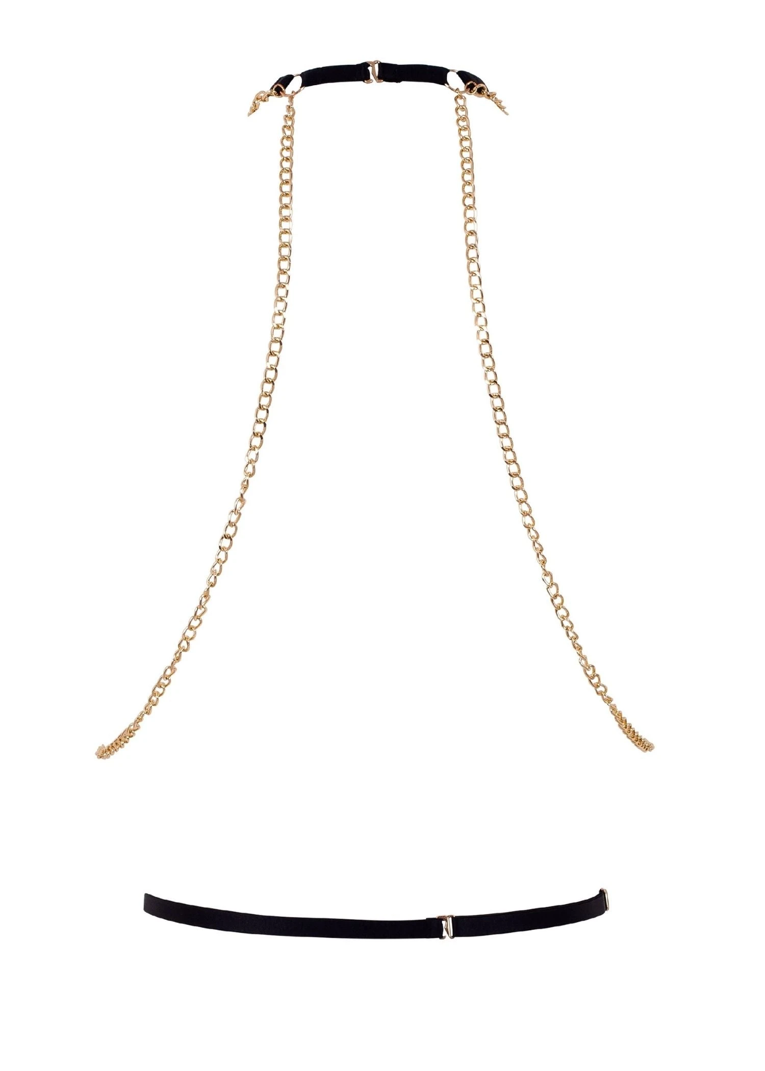 When fashion meets function, the Theodora Chain Harness features cascading gold-tone chains connected to a soft collar and soft underband. Wear alone as a statement piece or as an outerwear accessory for an effortless and unique look.