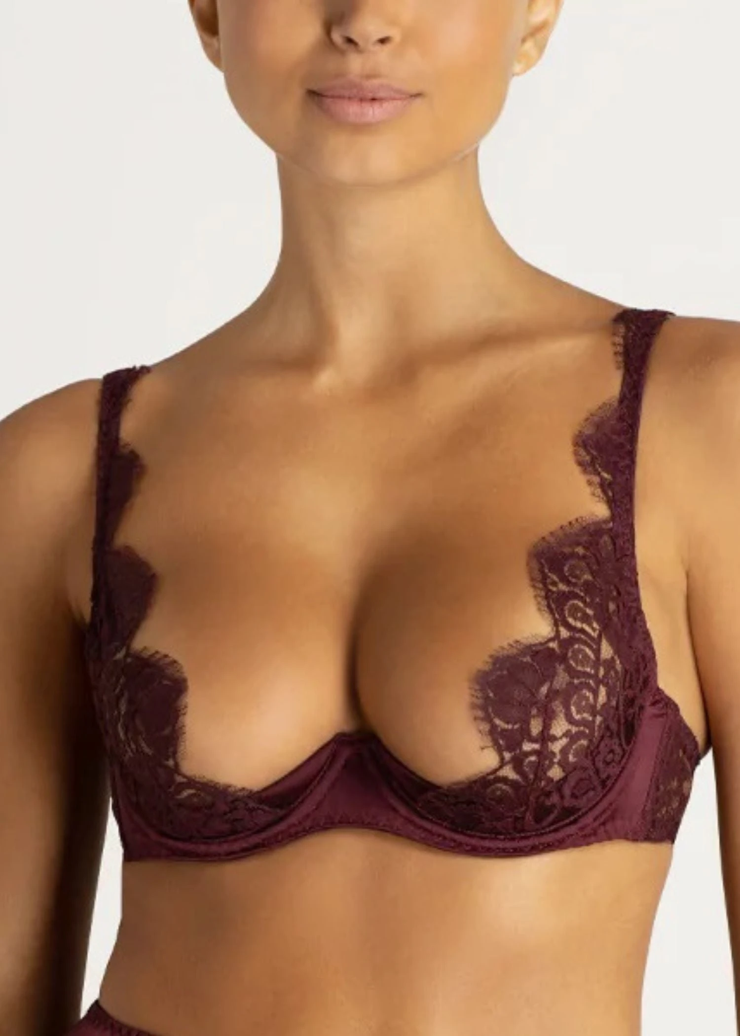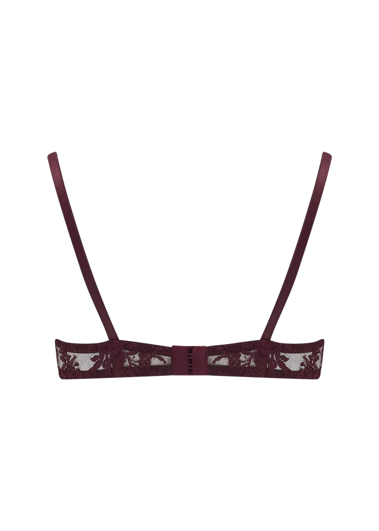 With an ultra wide plunge bra, this Camellia High Apex Bra lifts and enhances your cleavage for a barely-there dramatic effect. Made with indulgent French Leaver lace and silk slings in a rich bordeaux wine hue, it is both tempting and decadent.
