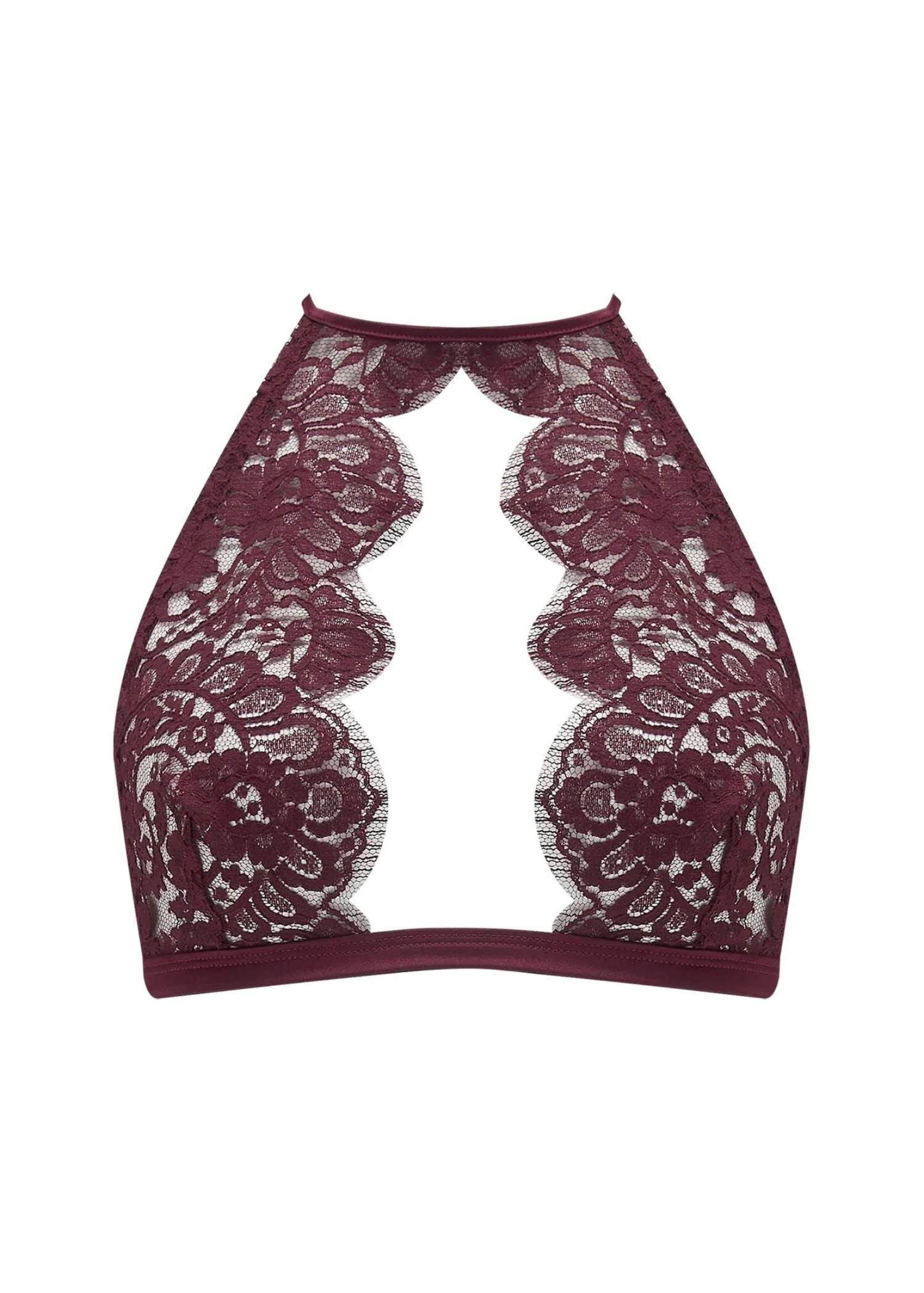 The Camellia Soft Cup Bra is enchantingly feminine and alluring. With the delicate halter in scalloped edge French lace, it gently flirts showing cleavage through the centre parting.