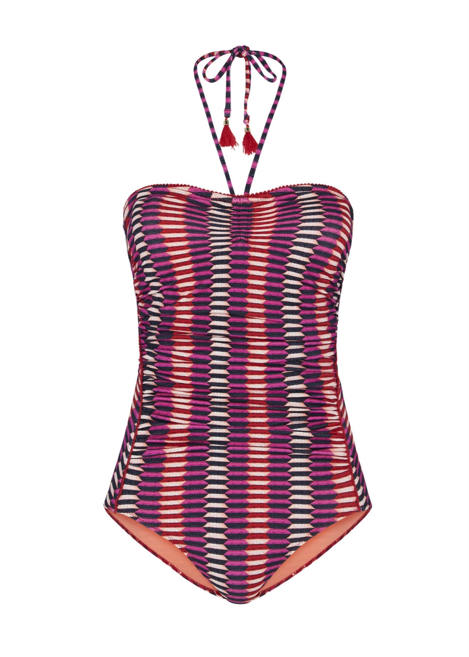 Showcasing a halterneck with tassels and pom pom trims at the end, the colourful Catalina Kisses One Piece with Padding Swimwear features ruching and flattering seam lines across the front body for a natural, figure-flattering fit. The retro tribal print is fun and vibrant, perfect for a sunny day at the beach.