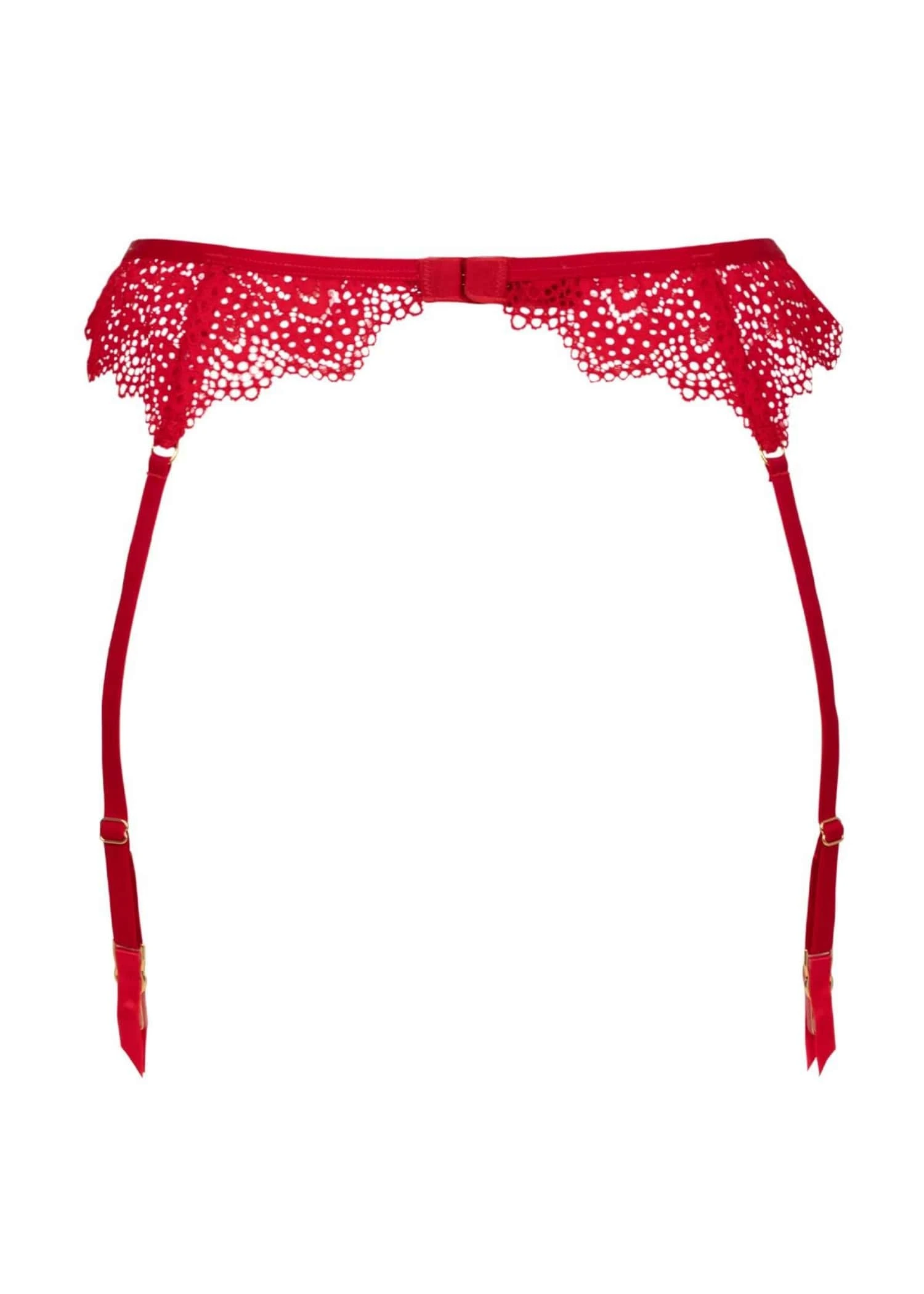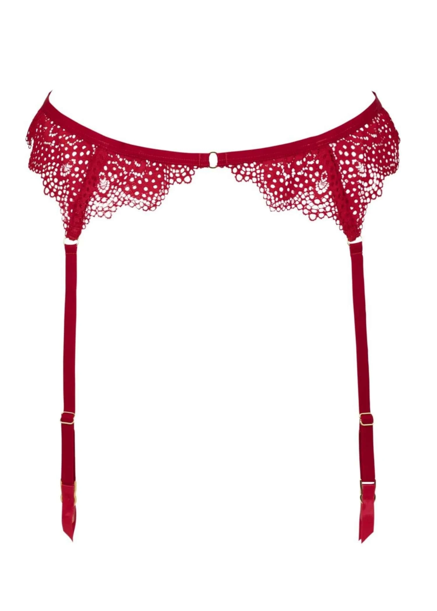 A delicate lace suspender featuring gold-tone hardware detailing that will compliment any stockings for a touch of elegance. Complete the Desire Rouge collection with the matching bra and thong for the perfect ensemble.