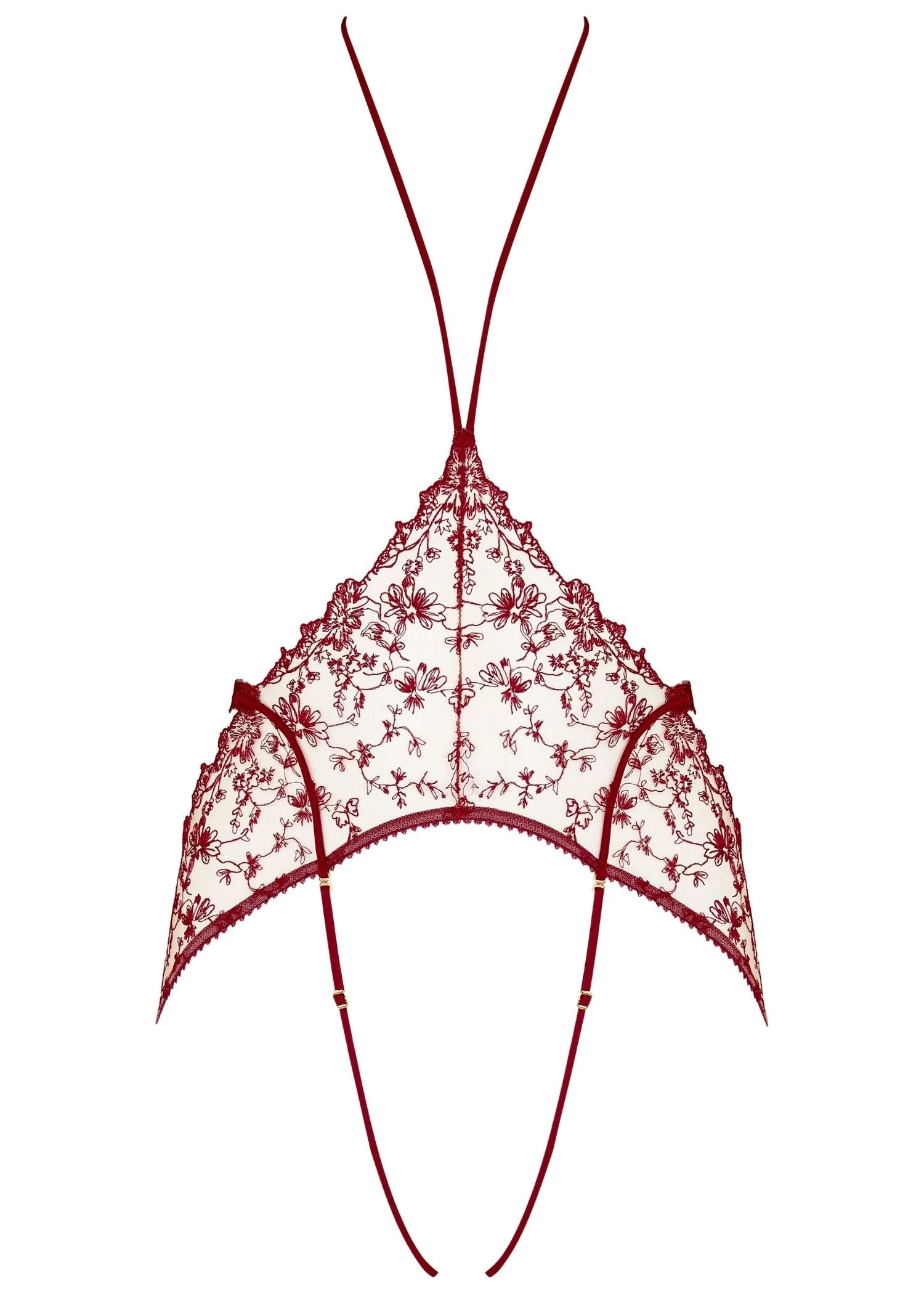 Sculpting your figure by lifting your bum and framing your front, the Gaia Harness is truly magical. Made from luxe soft tulle with red Swiss embroidery, featuring silk strap details and gold hardware, this delicate harness is sure to infuse your boudoir with romance.