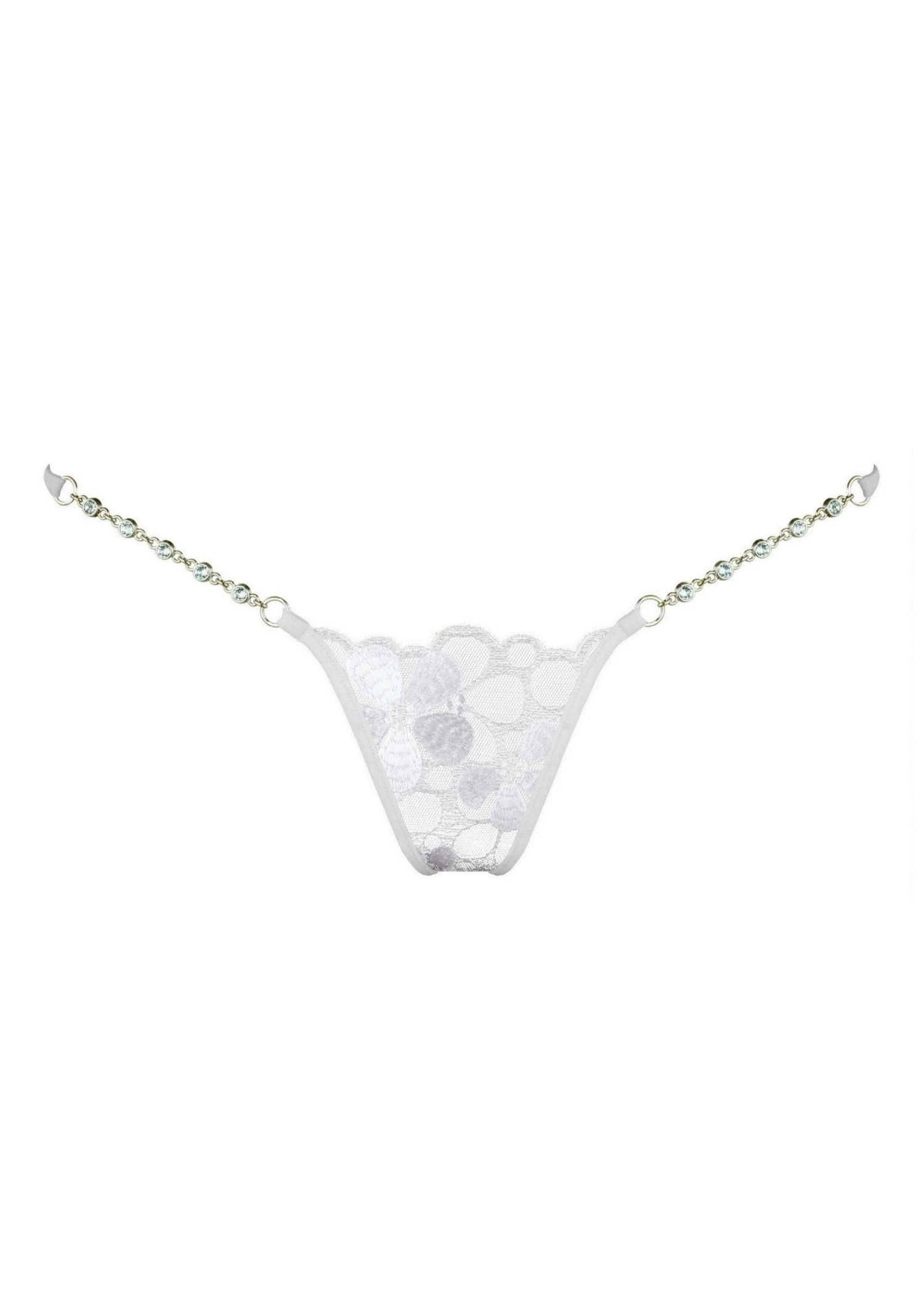 Delicate Swiss floral embroidery rendered on white tulle with Swarovski rhinestones forming the pistil makes this sexy micro g-string shining brighter than the mother of pearls.