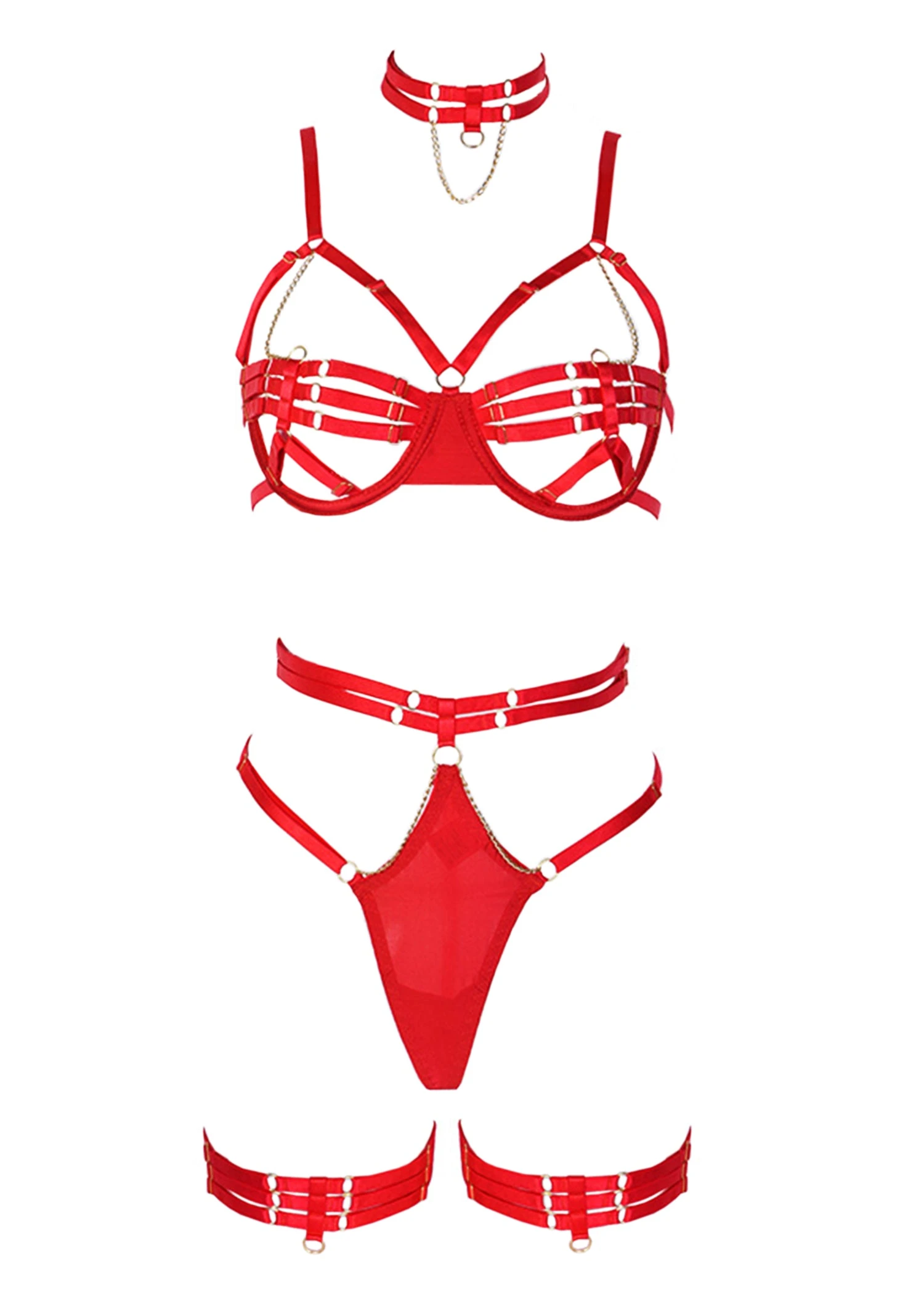 - 4Â piece set includes:Â Open Bra, Choker, Thong, Garter Belt