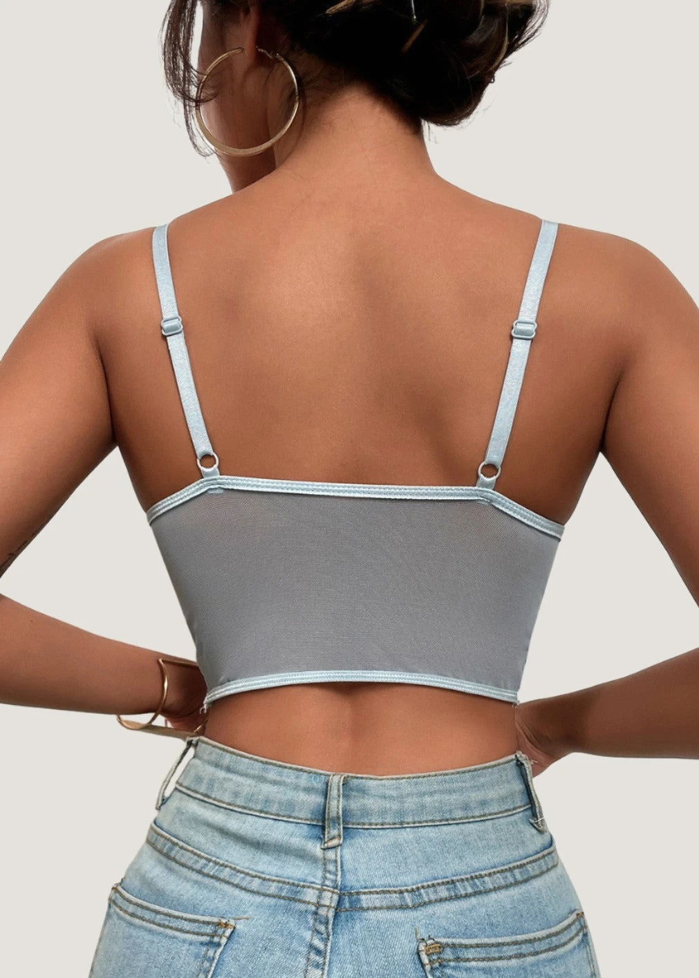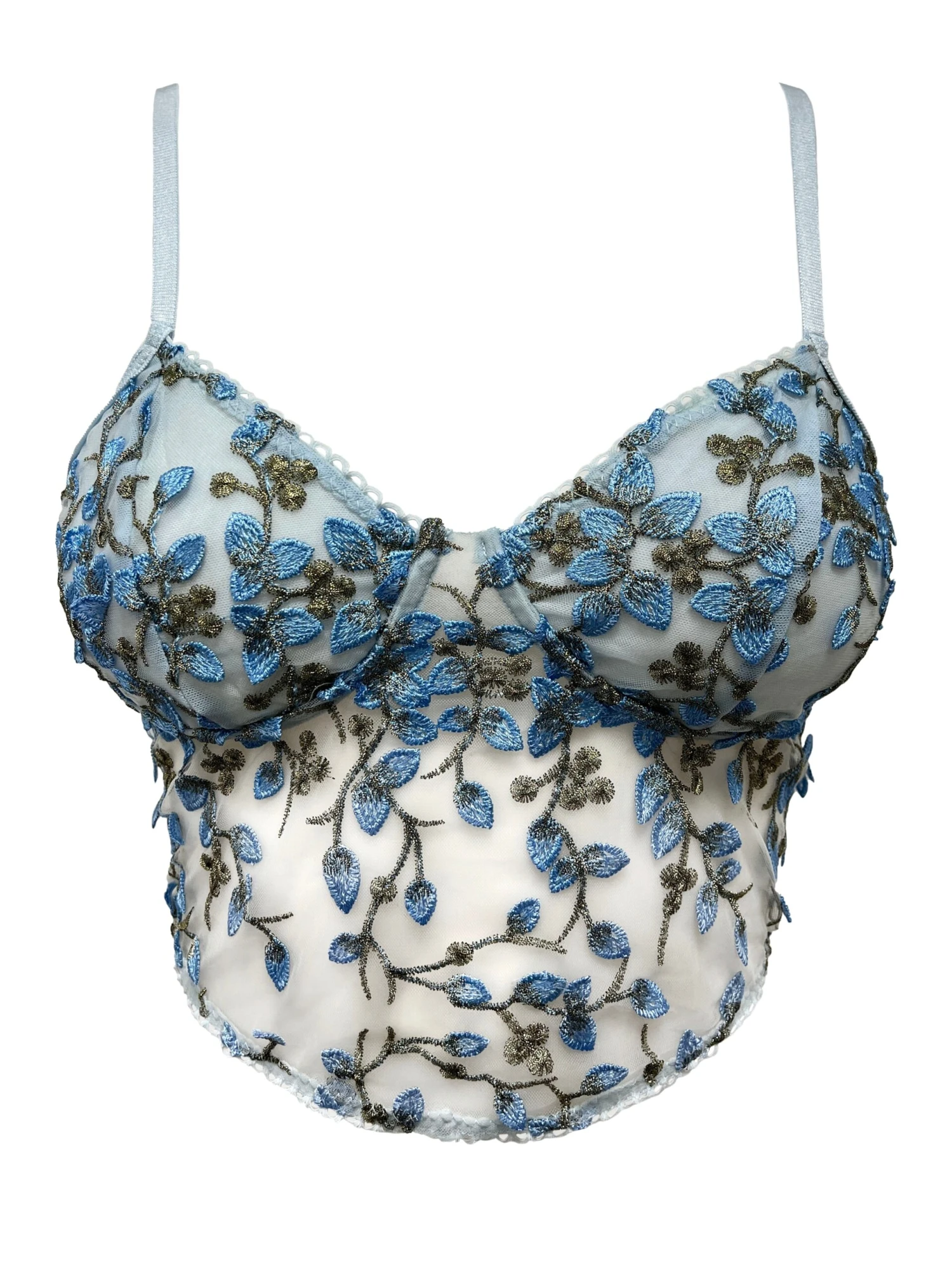 This balconette style longline bra in sky blue color, features a gorgeous floral embroidery over sheer mesh. Wear this under your favorite blazer outfit for a fashionable killer look.