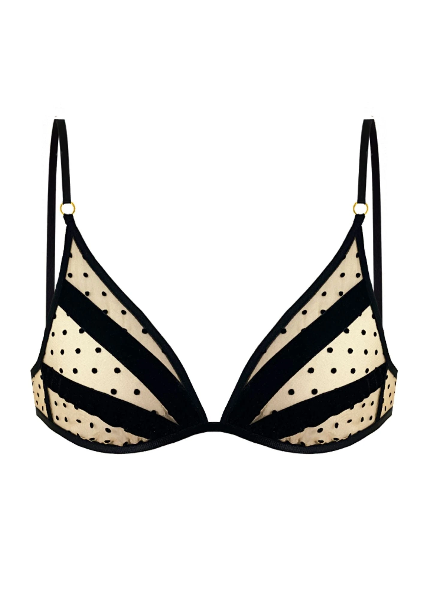 Reminiscent of the polka dots retro pin-up girls used to wear, this bra puts a clear spin on it with velvet dots on nude mesh.