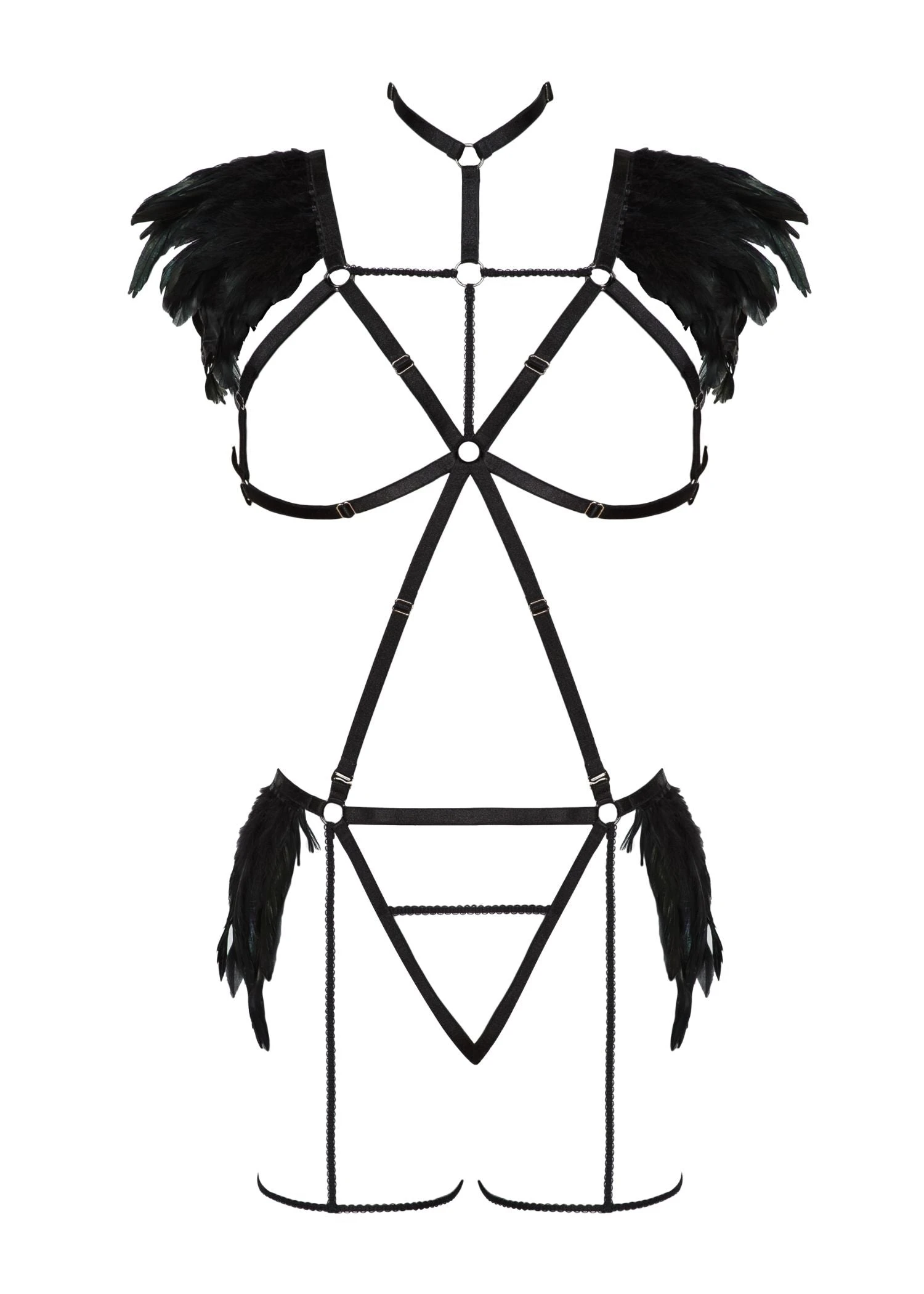 Show off your curves with this Night of Revelations set by Baed Stories. This courageous bondage bodysuit features intertwine straps and detachable thongs with a hook-and-eye fastening, embellished with black feather detailing to awaken your sexual energy.