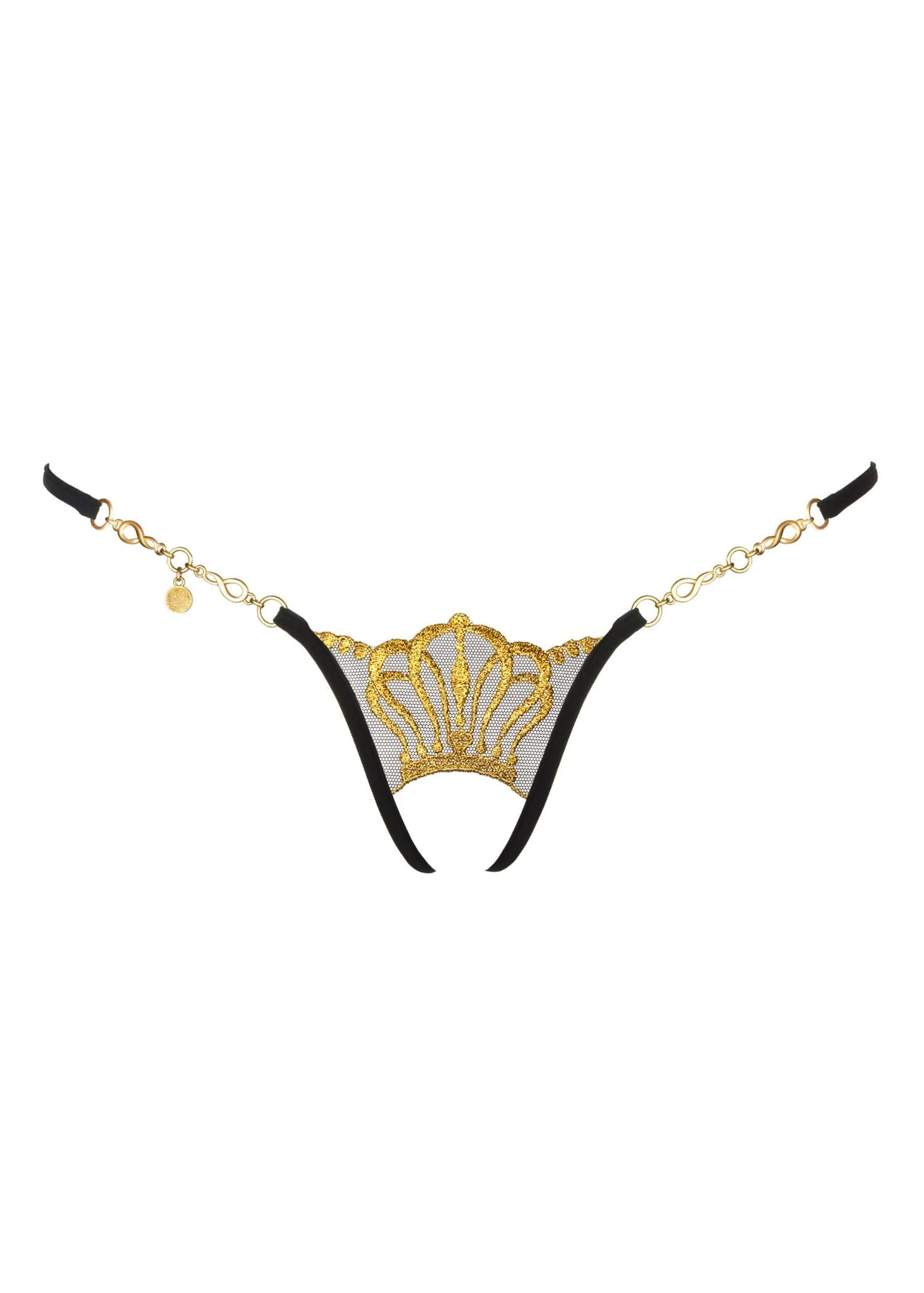 Above the buttocks, the luxurious ouvert thong is crowned with a small triangle with black, shiny embroidery in the shape of a miniature crown.