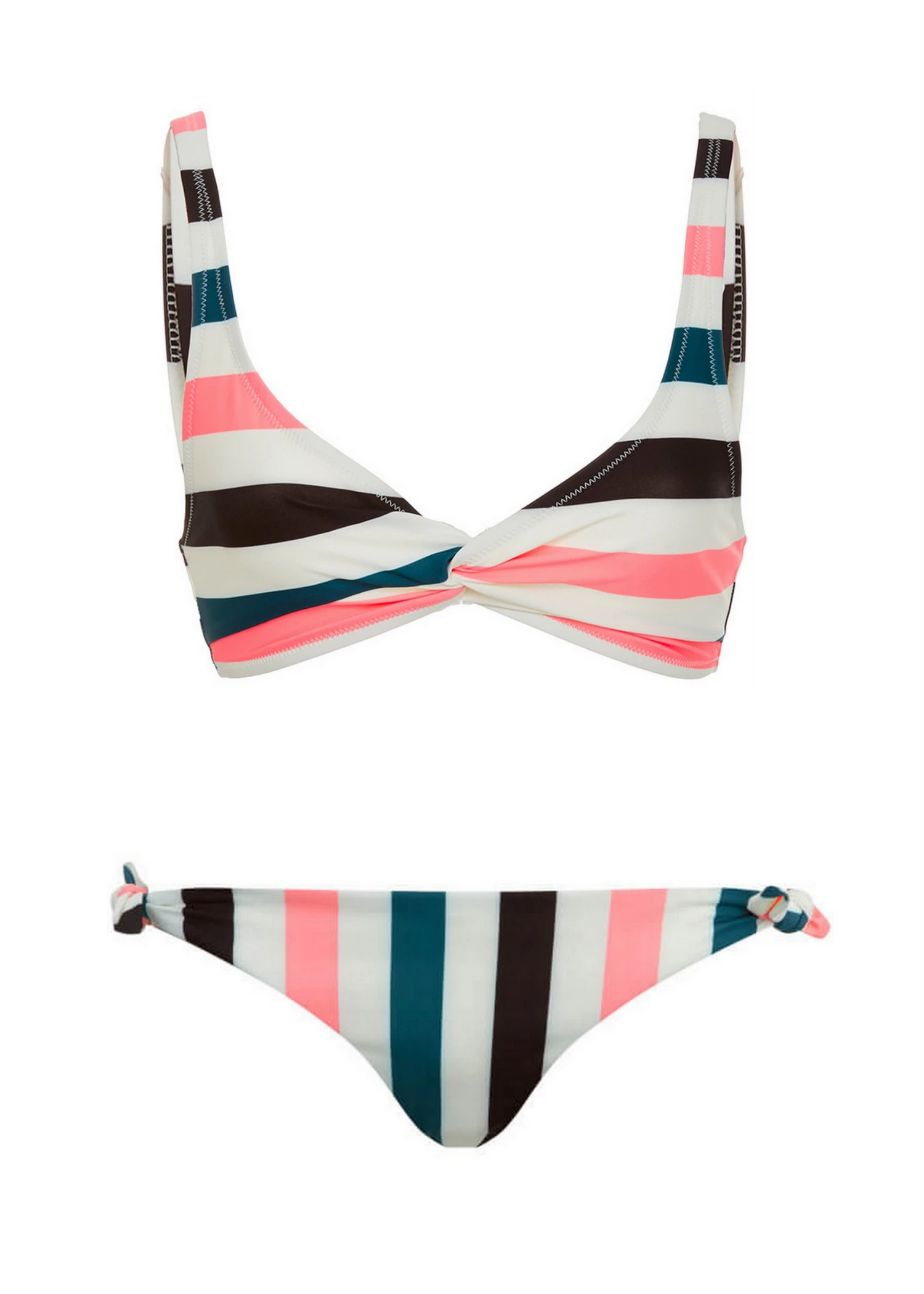 Bikini with twist centre in Black, Jade, and Coral Stripes with wide shoulder straps for support. Two piece bra closure at back and nickle-free hardware. Bottom has tie sides for adjusting.