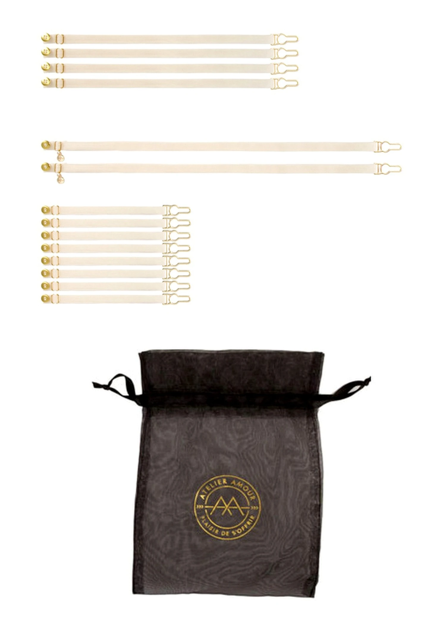 Comprising 14 elastic satin adjustable straps : 6 small, 4 medium and 2 large; the Unbearable Lightness Rendez-vous Kit is the one stop kit to spice up the bedroom. Let your imagination run wild unleash your creativity with different combinations and lingerie accessories.