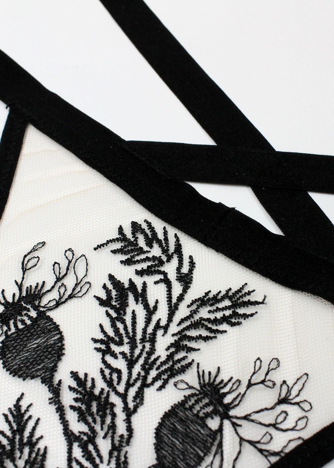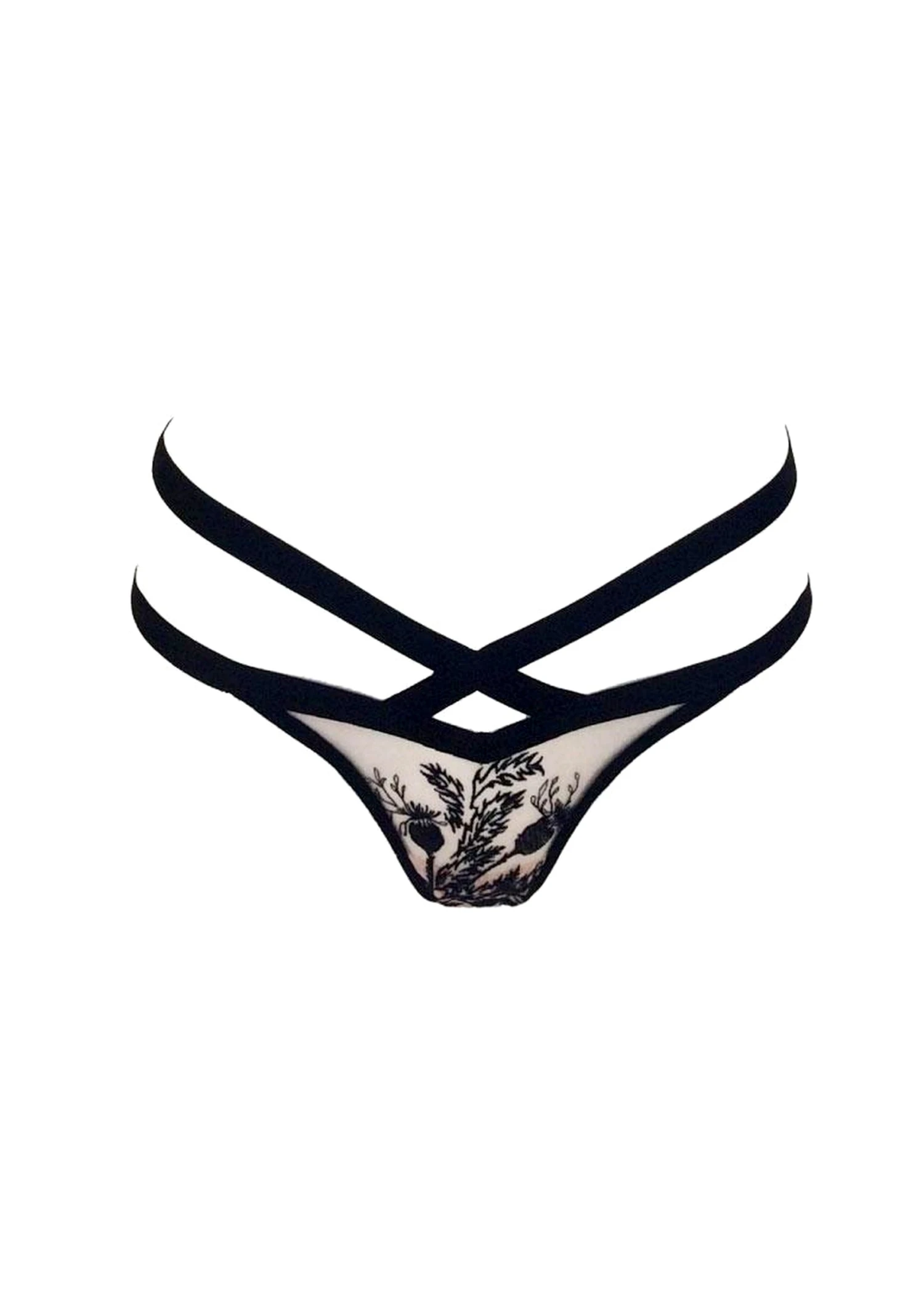 Strappy doesn’t have to be uncomfortable with these super soft elastic straps and delicate tulle. A beautiful and unique set when paired with the matching bra.