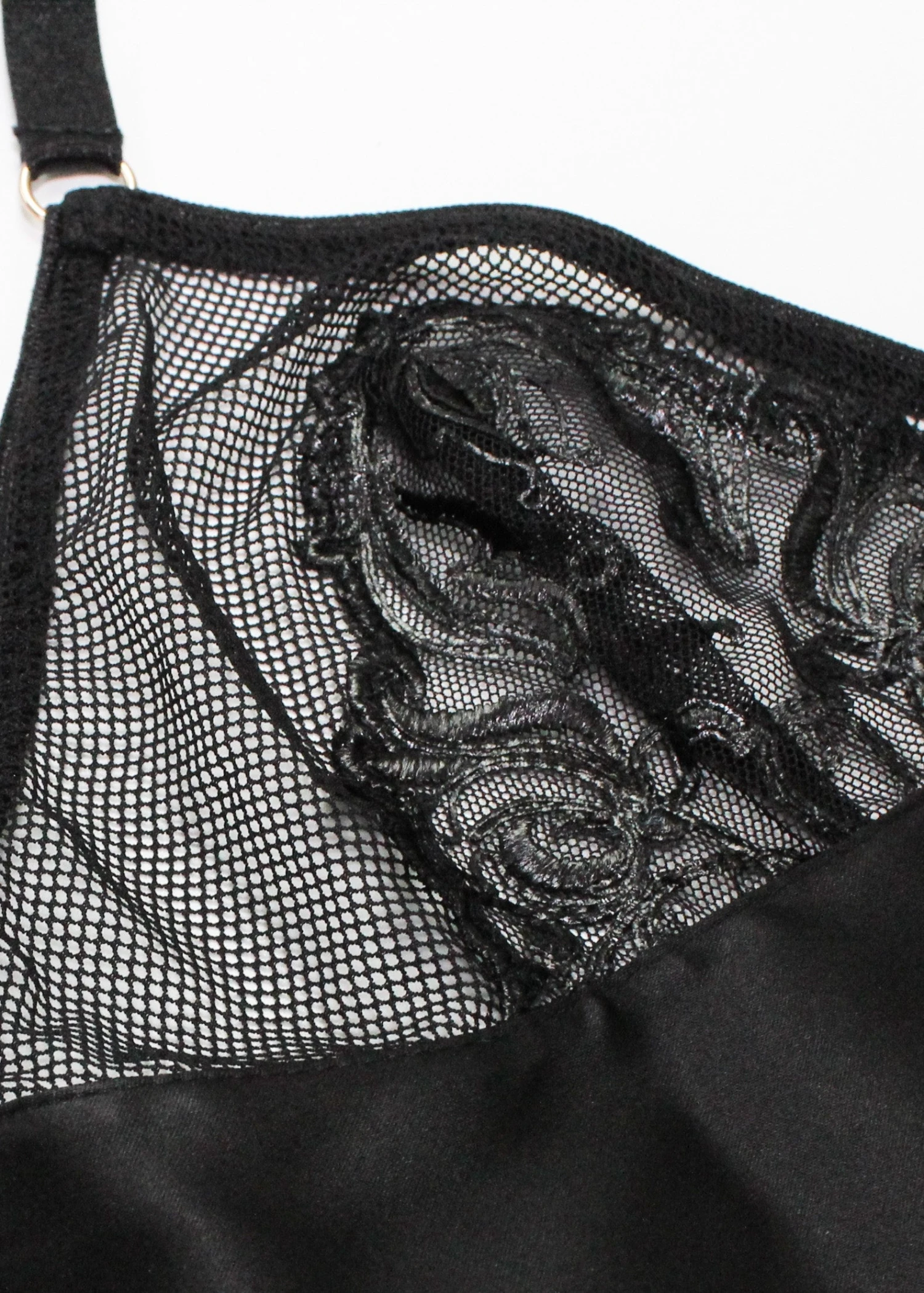 - Embroidered tulle, 100% silk, net fabric, and satin elastic straps
